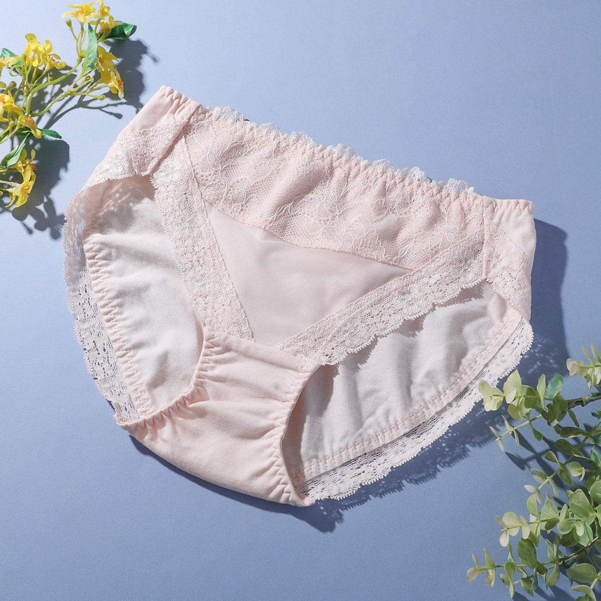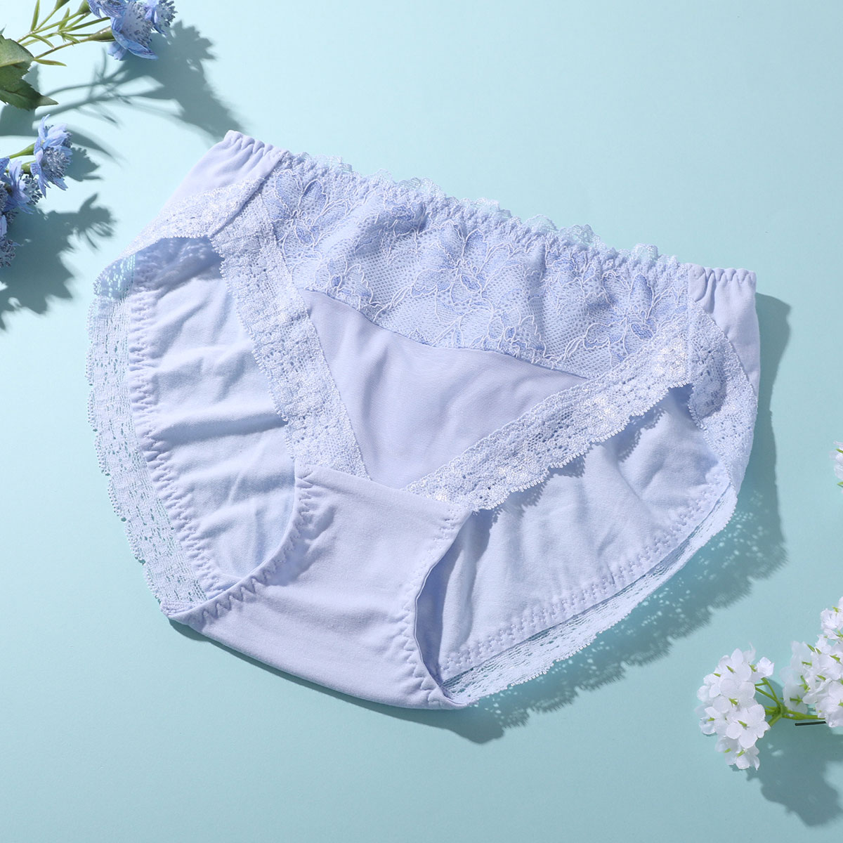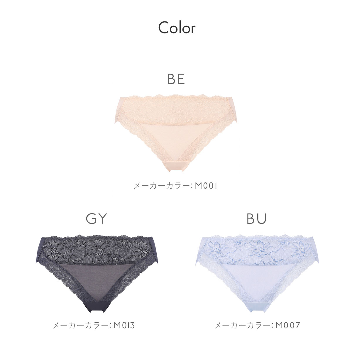 身生地は綿混素材を使用。脚口のレースは裏マイクロファイバー糸づかいで、柔らかな肌ざわりです。前後脚口はレース仕様のため、アウターにひびきにくく、くいこみにくくなっています。