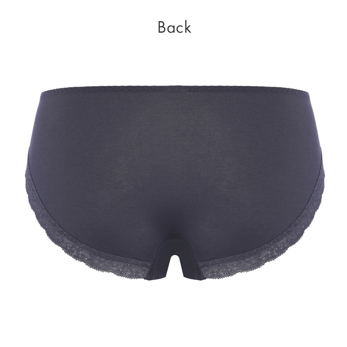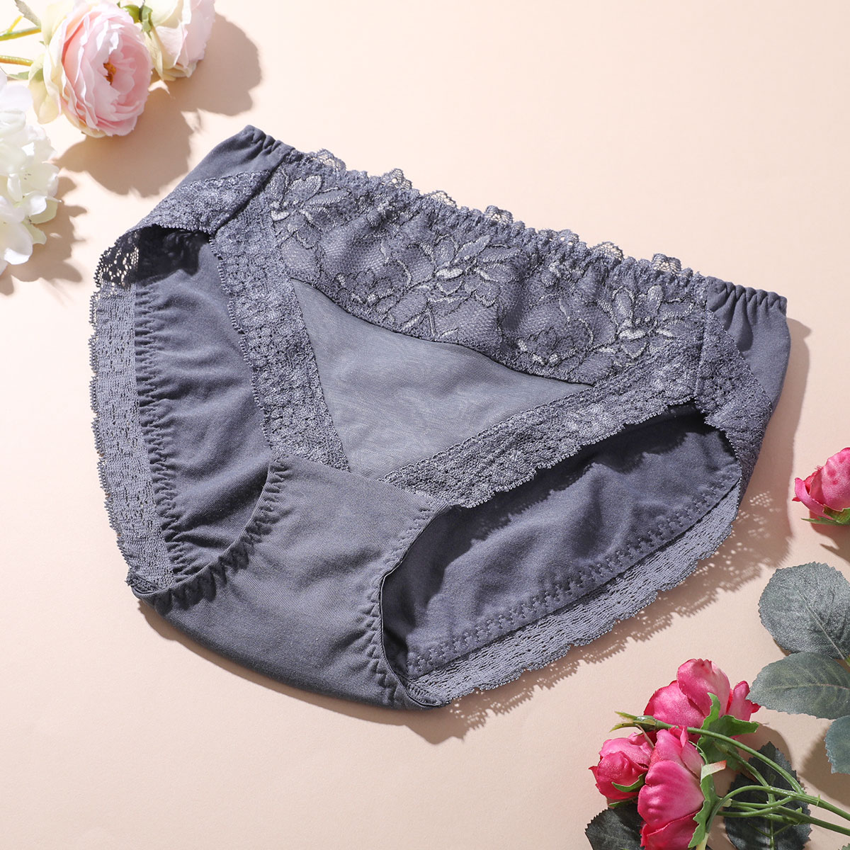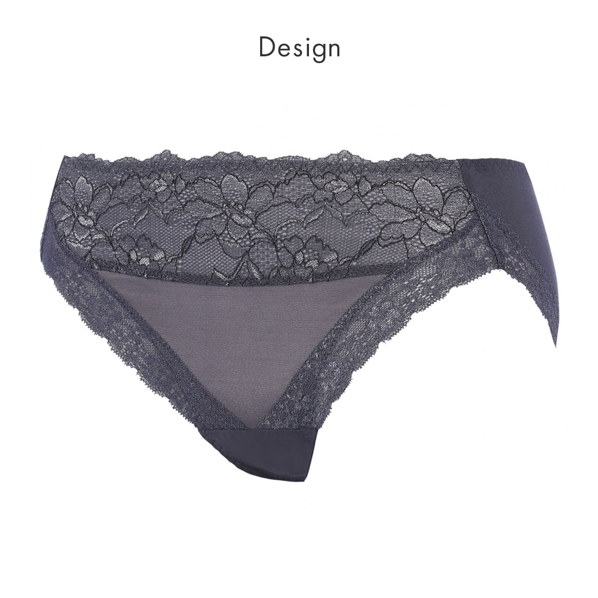 身生地は綿混素材を使用。脚口のレースは裏マイクロファイバー糸づかいで、柔らかな肌ざわりです。前後脚口はレース仕様のため、アウターにひびきにくく、くいこみにくくなっています。
