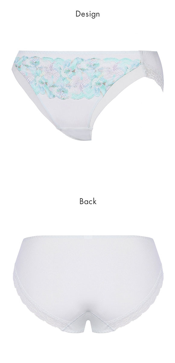 身生地は綿混素材を使用。後ろ脚口のレースは、裏マイクロファイバー糸づかいで柔らかな肌ざわり。アウターにひびきにくくなっています。前脚口はメッシュ生地折り返し仕様なので、くいこみにくくなっています。