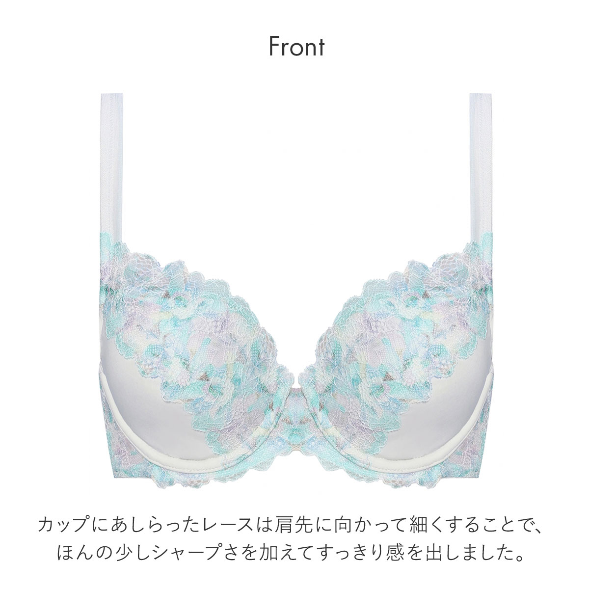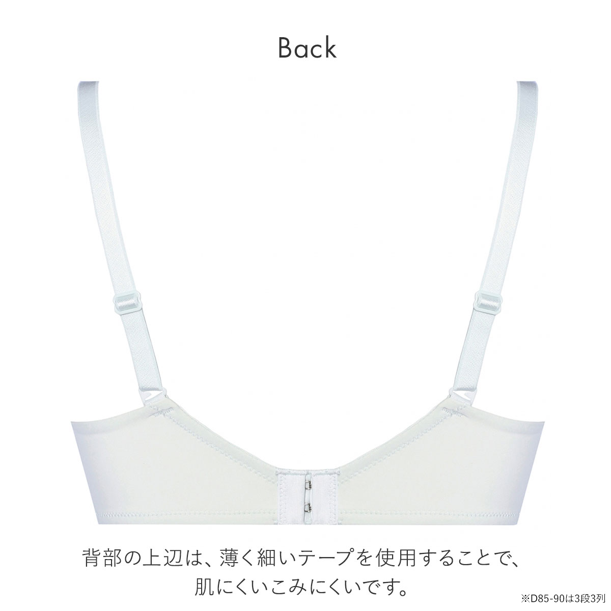 フロント中心部のワイヤーを薄くフラットにし、外側に反らせた「NEWエンジェルワイヤー」を使用。肌にくいこみにくく、痛くなりにくくなっています。背部の上辺は薄く細いテープを使用することで、肌にくいこみにくいです。ストラップは伸縮性に富む生地を使用しているため、肩にフィットしてよく伸びます。ストラップのとめ具に三角形の特殊な形をした「デルタマジック」を使用しているので、肩からずれ落ちにくくなっています。ストラップにアジャスターがついているので長さの調節が可能です。