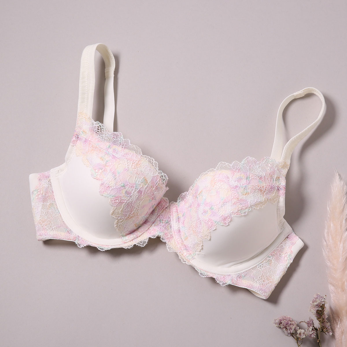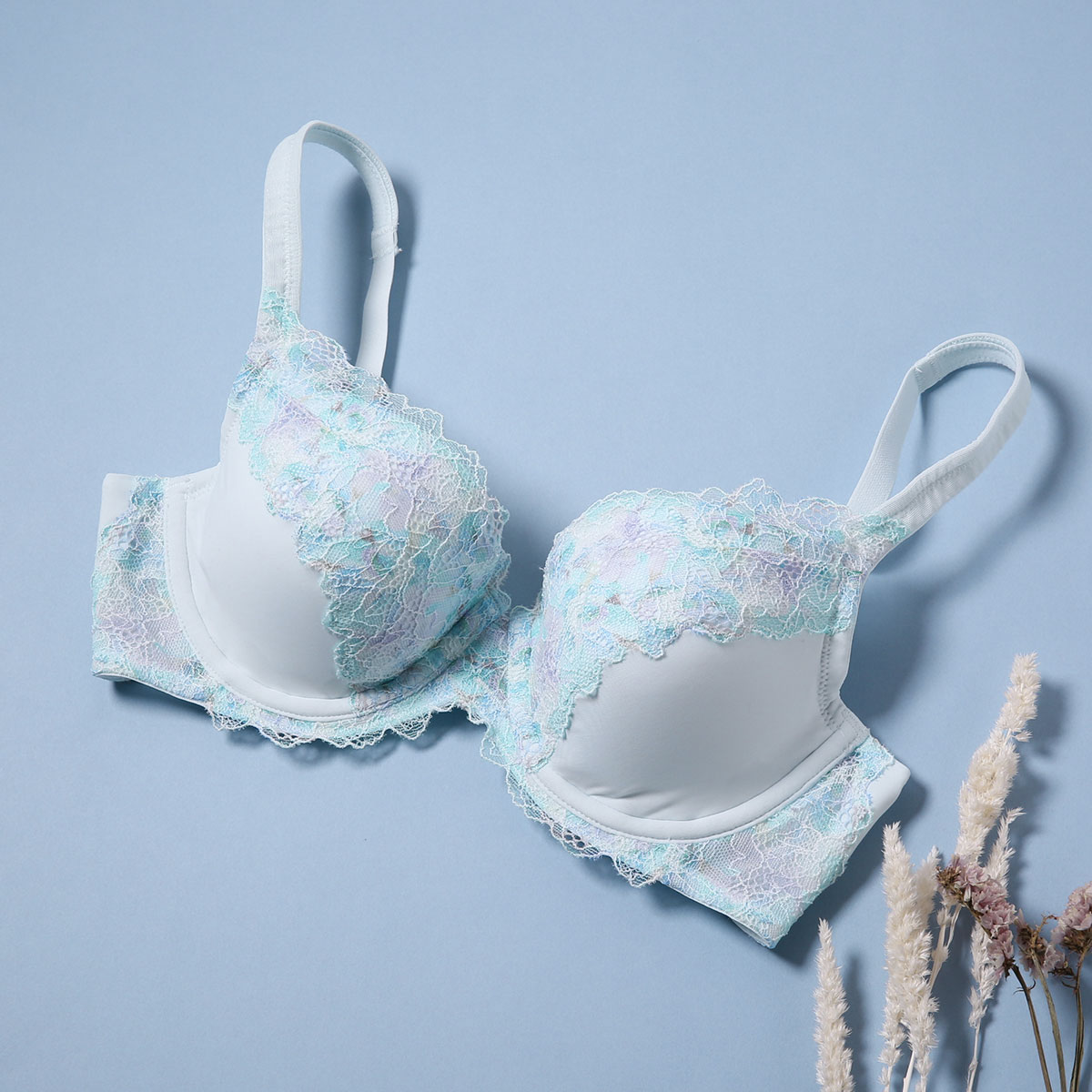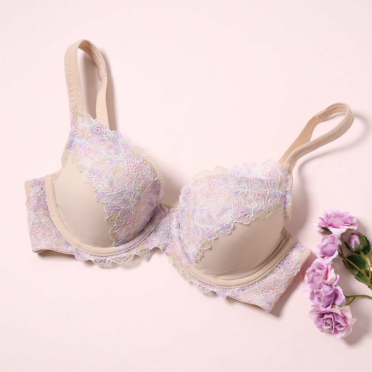 恋するブラTR613は、繊細な編みレースとプレーンな生地を組み合わせたアウターにひびきにくいデザインでありながら、レースに施したマルチカラーのプリントでとても華やかな雰囲気です。カップにあしらったレースは肩先に向かって細くすることで、ほんの少しシャープさを加えてすっきり感を出しました。