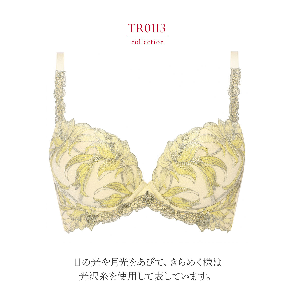 ツヤのあるグラデーションカラーのエンブロイダリーレースで、うつろいゆく空を表現したエレガントなTR0113シリーズ。日の光や月光をあびて、きらめく様は光沢糸を使用して表しています。