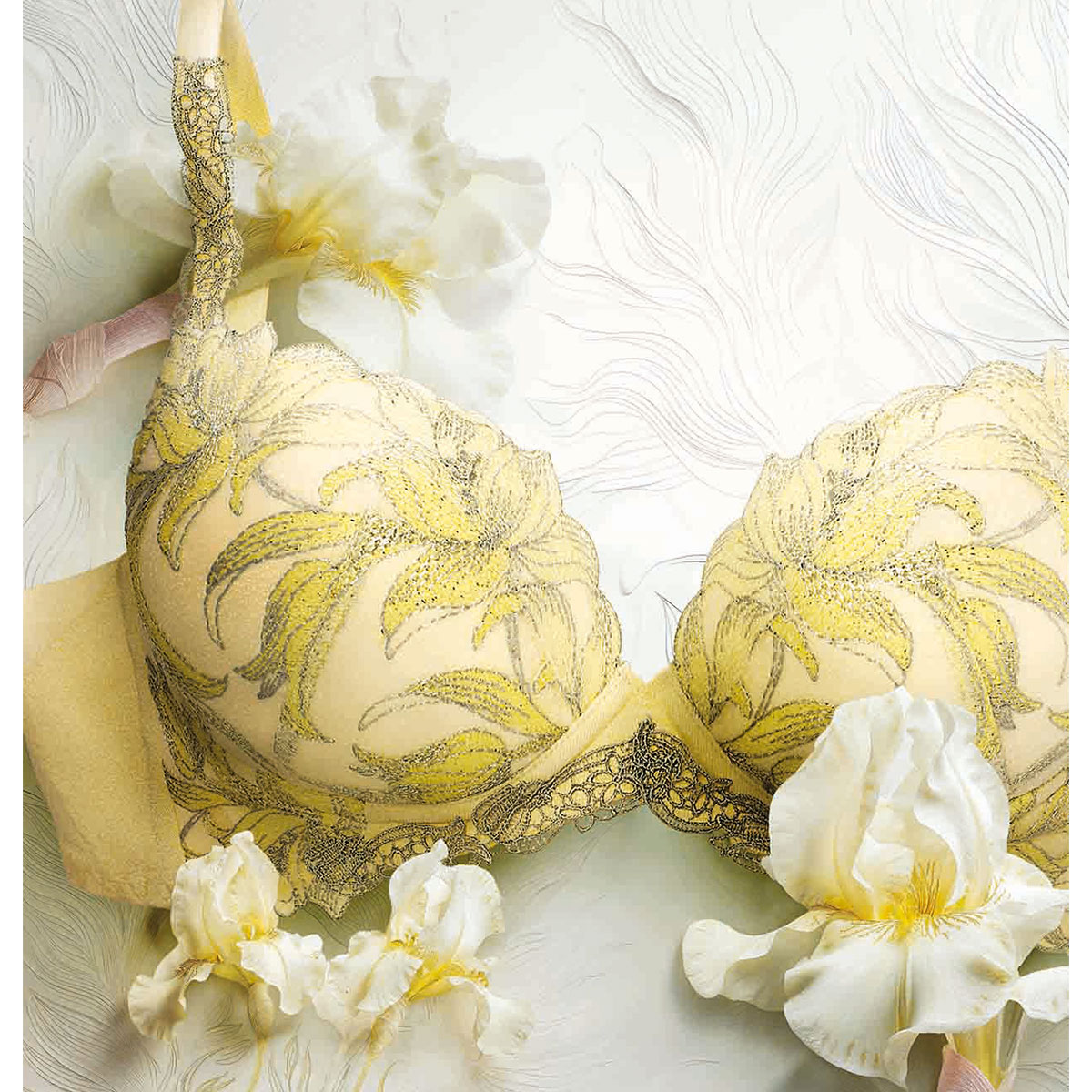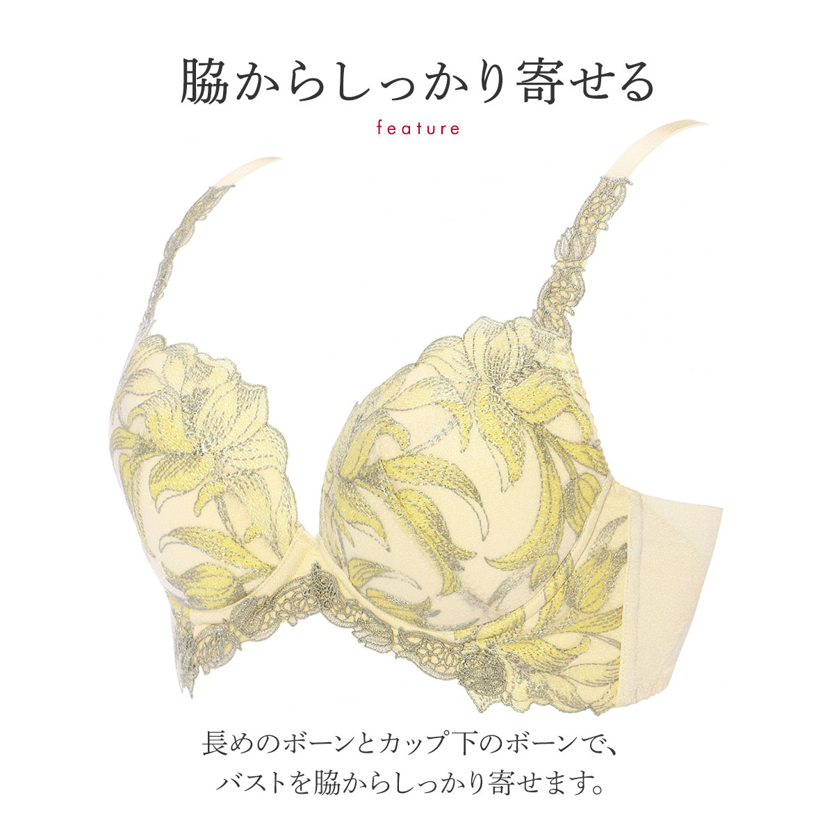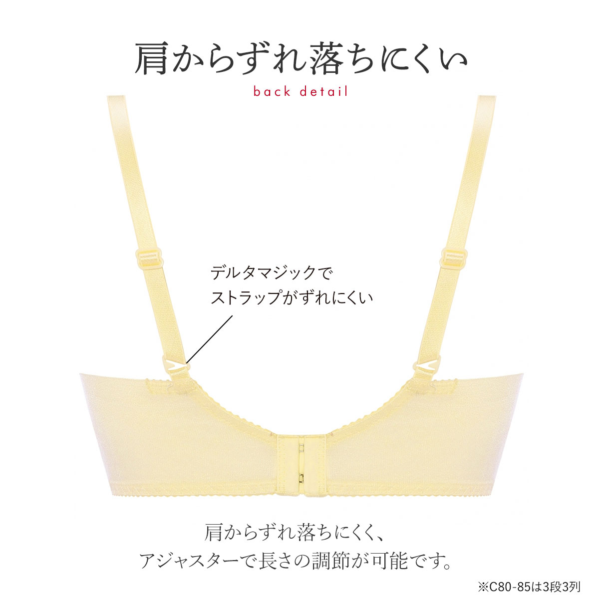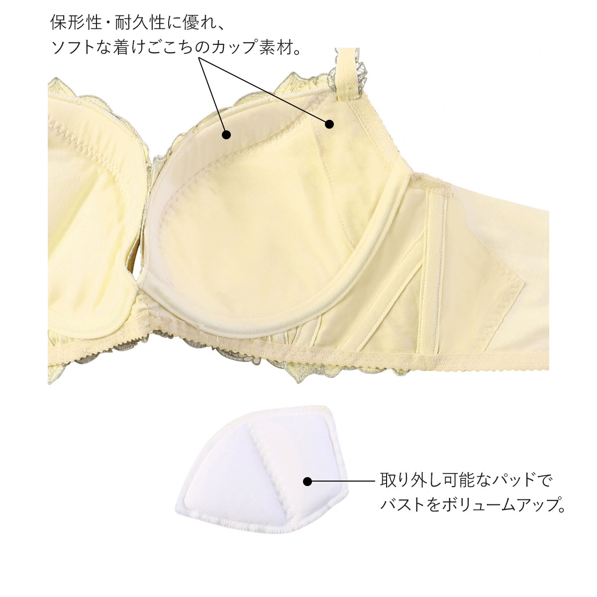背部上辺のフラット仕様でアウターにひびきにくいです。保形性・耐久性に優れ、ソフトな着けごこちのカップ素材、「エンジェルクッションライト」を使用しています。カップ内側に脇寄せ効果を高めるリフトアップパーツ付き。取り外し可能なパッド入りでバストをボリュームアップします。