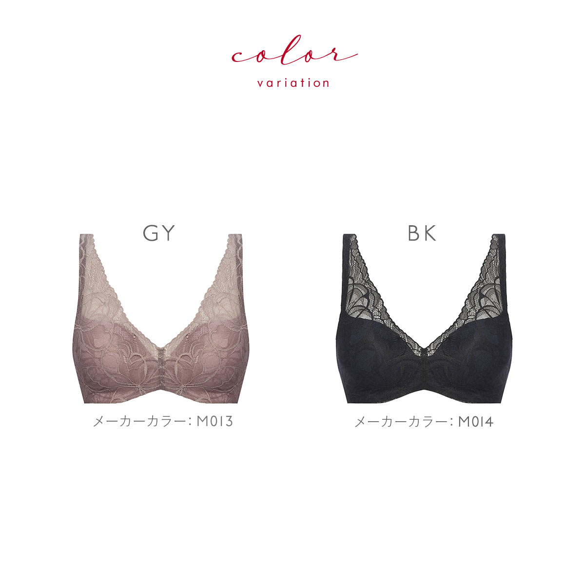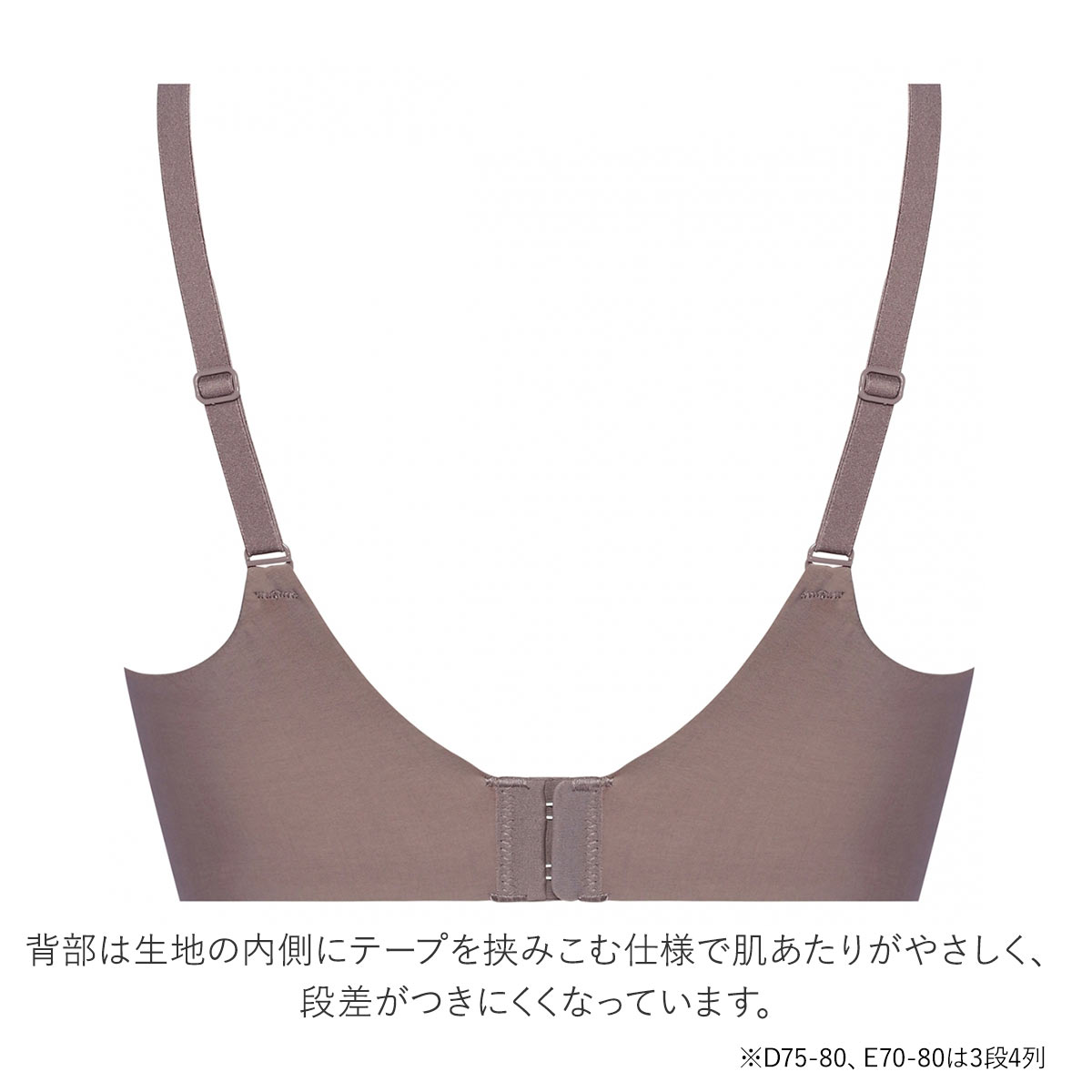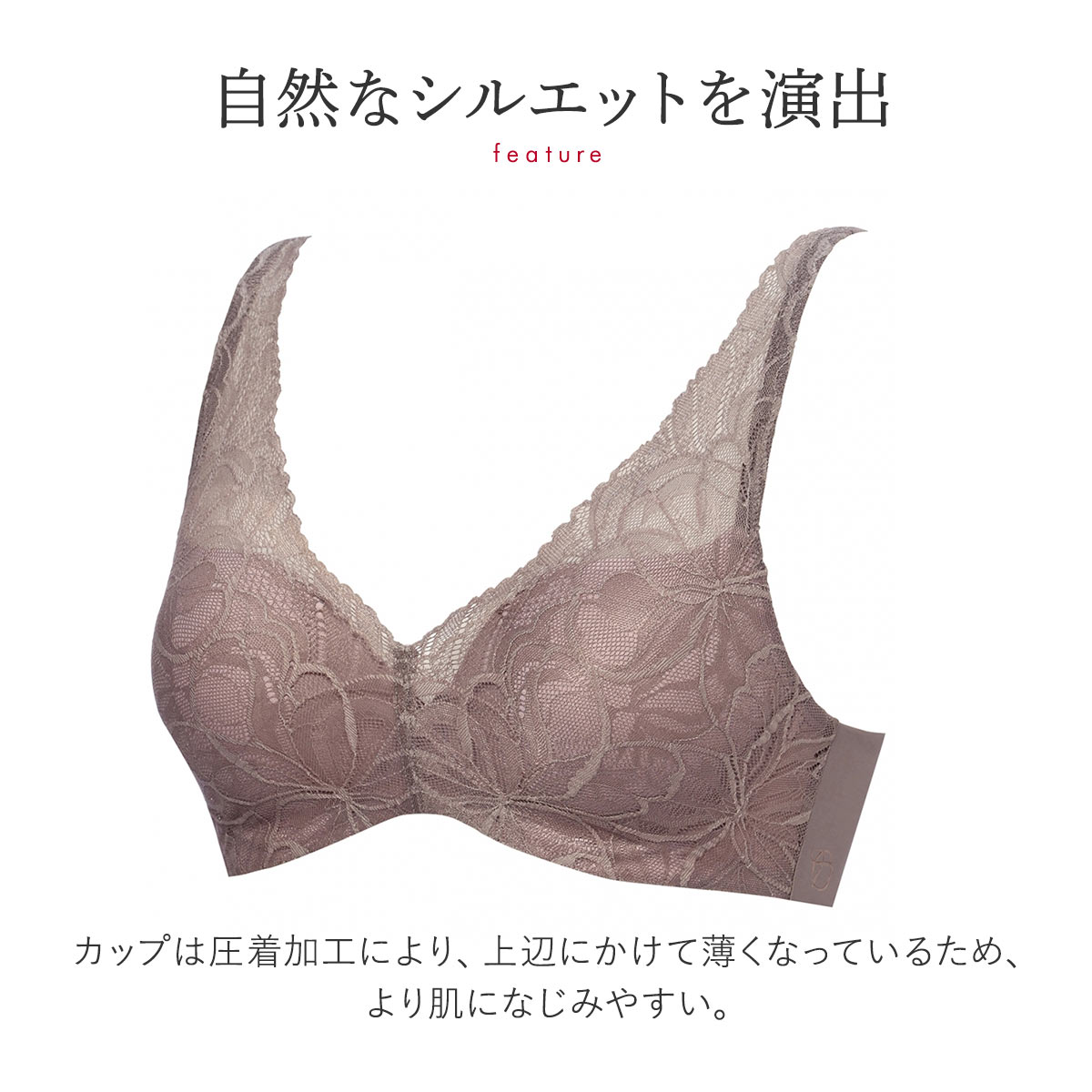 カップは圧着加工により、上辺にかけて薄くなっているため、より肌になじみやすく、カップ上辺の浮きを軽減します。通常のワイヤーよりしなやかで細い新開発のソフトワイヤー『コンフォート・ワイヤー(R)』を使用しています。