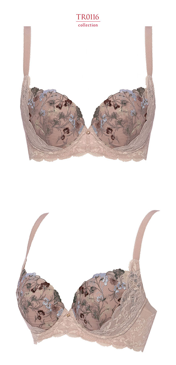 天使のブラ魔法のハリ感TR0116シリーズは、グローバルトレンドの「マルチカラー」をエンブレースで取り入れたシリーズ。繊細な草花にひっそりとトリンプの「T」のロゴを施しています。