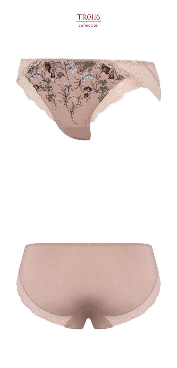 天使のブラ魔法のハリ感TR0116シリーズは、グローバルトレンドの「マルチカラー」をエンブレースで取り入れたシリーズ。繊細な草花にひっそりとトリンプの「T」のロゴを施しています。