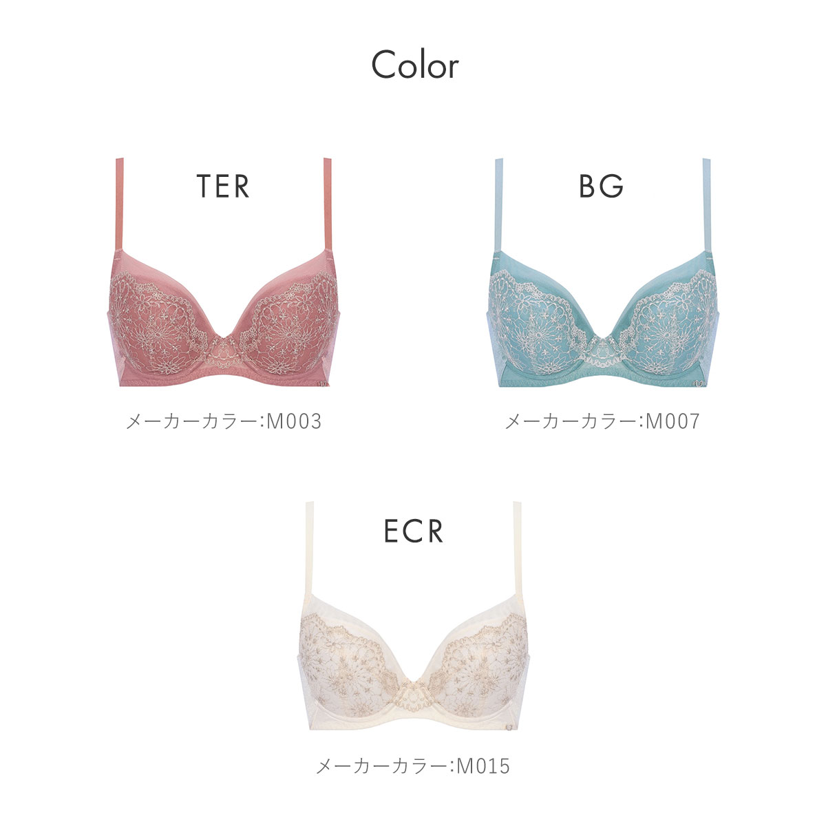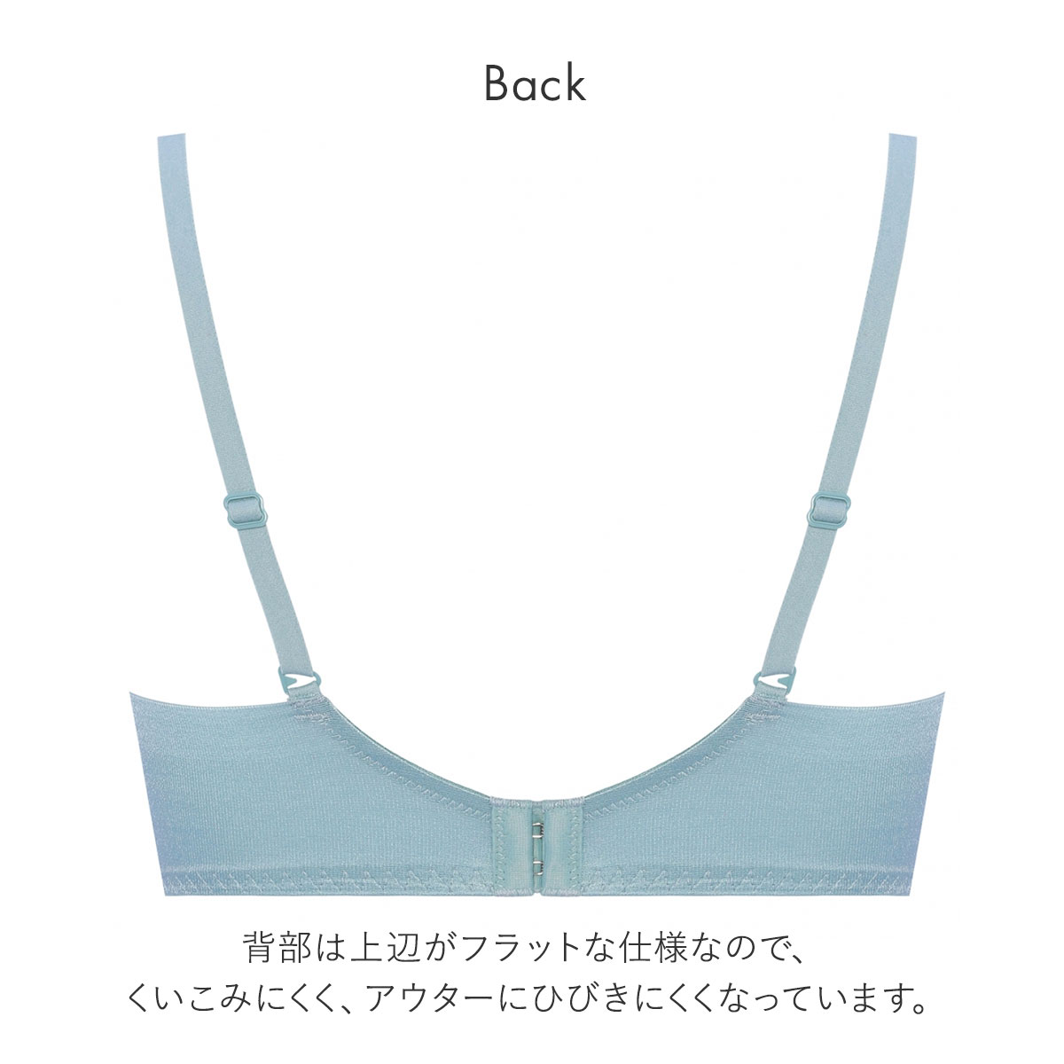 カップサイドの「サイドコンシャス」で、脇をすっきりとさせ、きれいな谷間をキープします。ファイバーフィルパッドで、ボリュームアップします。背部は上辺がフラットな仕様なので、くいこみにくく、アウターにひびきにくくなっています。ストラップとめ具に三角形の特殊な形をした「デルタマジックR」を使用しているので、肩からずれ落ちにくくなっています。