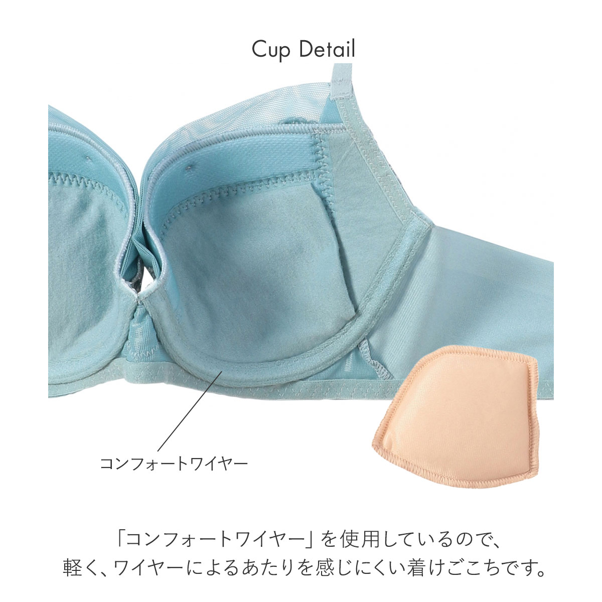 「コンフォートワイヤー」を使用しているので、軽く、ワイヤーによるあたりを感じにくい着けごこちです。カップ上辺にソフトパワーネットをあしらっているので、カップがバストになじみやすいデザインです。保形性・耐久性に優れ、ソフトな着けごこちのカップ素材「エンジェルクッションライトR」を使用しています。