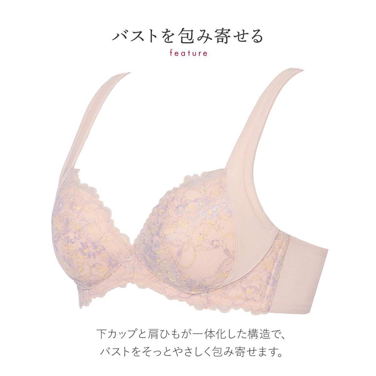 カップ、前肩ひも、カップ土台部分にやわらかく肌ざわりの良いポリウレタンシートを使用。ストレッチ性があり、やさしくフィットします。下カップと肩ひもが一体化した構造で、バストをそっとやさしく包み寄せます。背中部分の高さを高めにリニューアルしたので安定感がアップ。背中の上辺はテープレス始末で肌にくいこみにくくなっています。フック数は4列なので、体調や日々のサイズ変化に合わせて幅を調節できます。薄手でやわらかいファイバーフィルパッド入り。カップ下部中央に入る小さめなパッドです。バストの左右差やちょっとしたボリューム調整に使用できます。肩ひものとめ具に三角形の特殊な形をした「デルタマジック」を使用しているので、肩からずれ落ちにくくなっています。肩ひもにアジャスターがついているので、長さの調節が可能です。