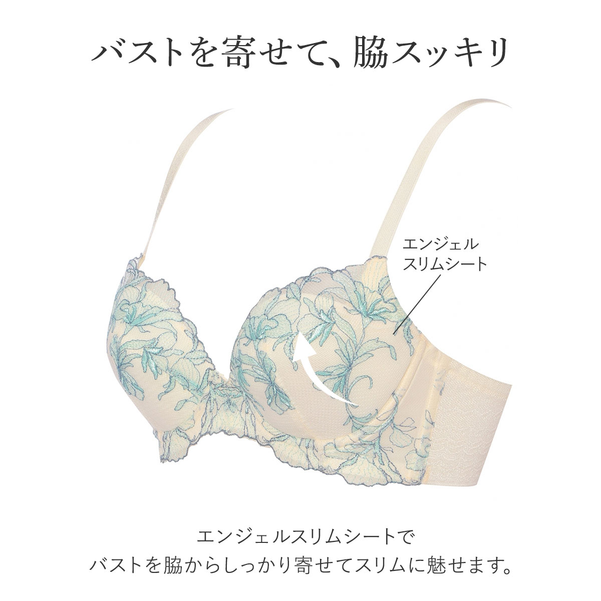 カップサイドの「エンジェルスリムシート」でバストを脇からしっかり寄せてスリムに魅せます。
