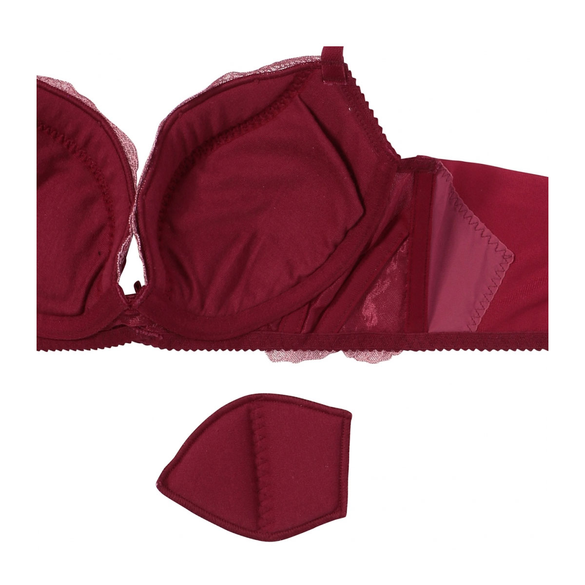 前中心が低く、カップ内側には伸びない素材のリフトアップパーツがあるので、バストを寄せて、魅力的な谷間を作ります。