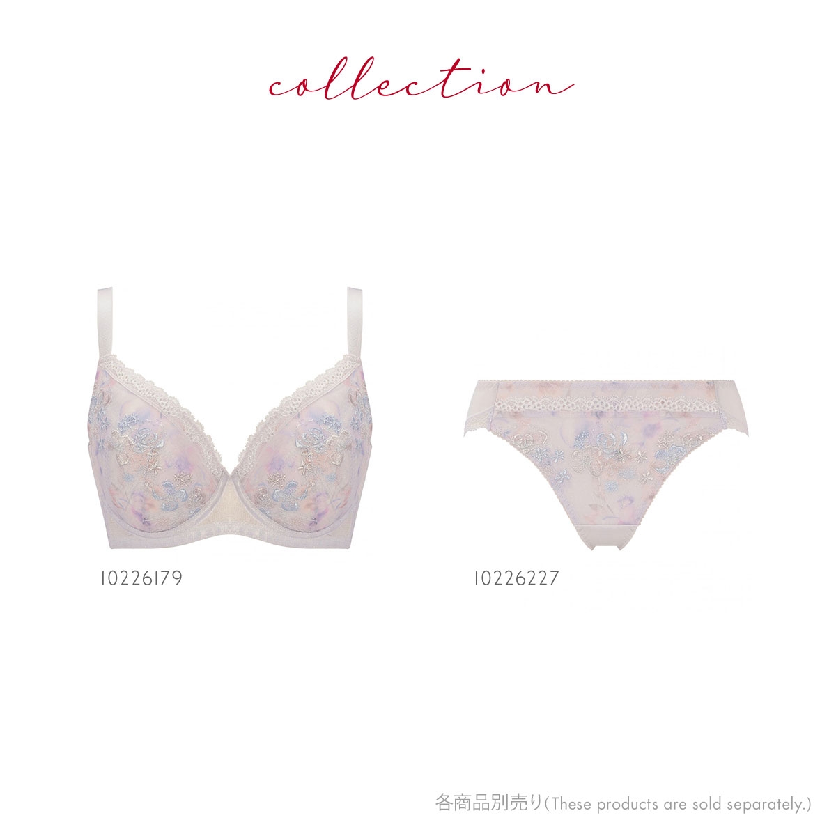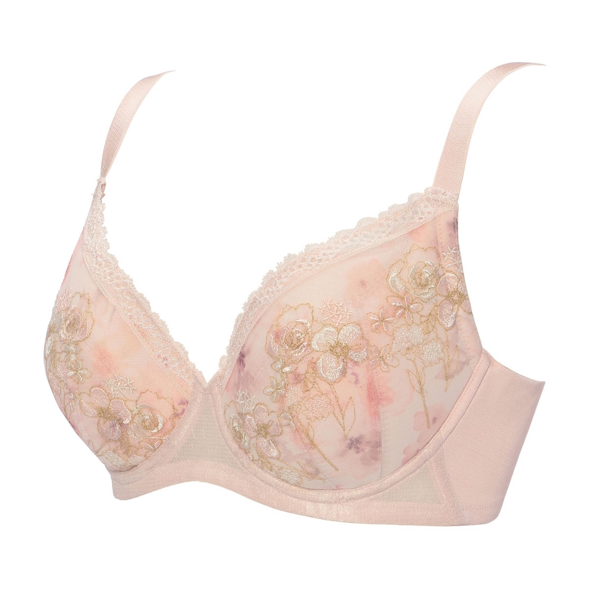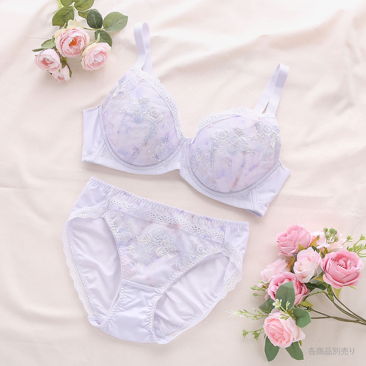 カップにはラナンキュラスの花をモチーフにした水彩画調のプリント生地に、ミックスフラワーブーケの刺繍レースを施しています。