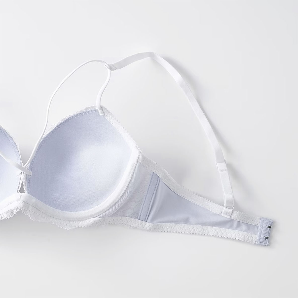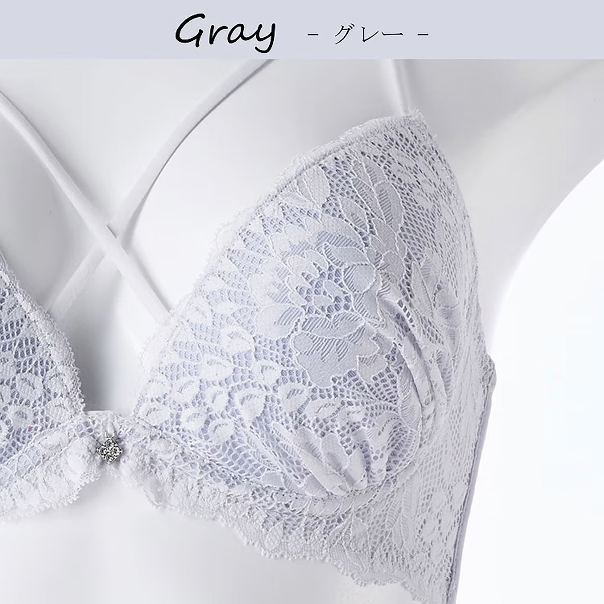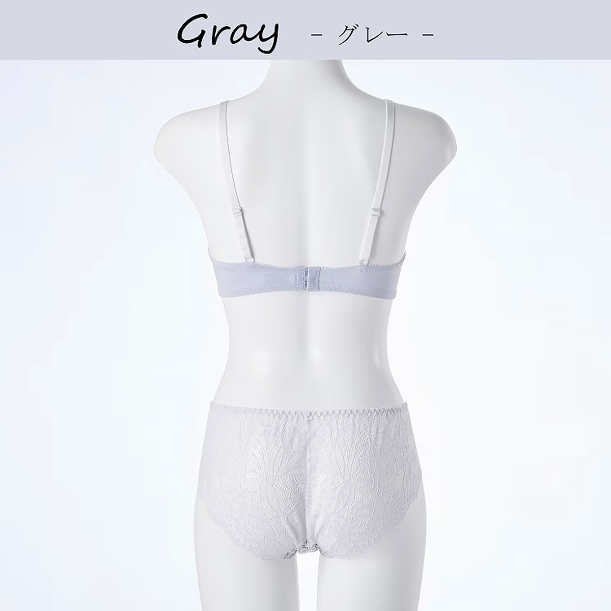 ブラジャーは下厚のモールドカップでバストをふっくらボリュームアップし、まあるいバストラインをメイクします。前中心が低いL字型ワイヤーは胸の中心にあたりにくいので痛くなりにくく、きれいな谷間を作りやすいのも嬉しいポイントです。