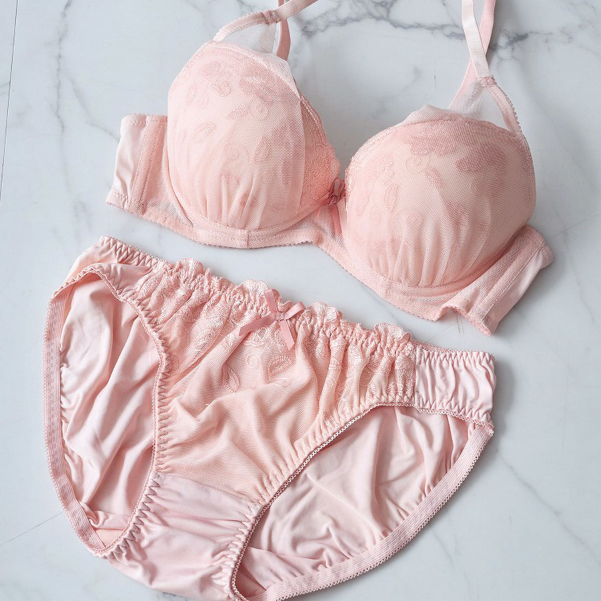 花束をイメージした花柄のレースをチュールネットで包み込んだブラショーツセット。