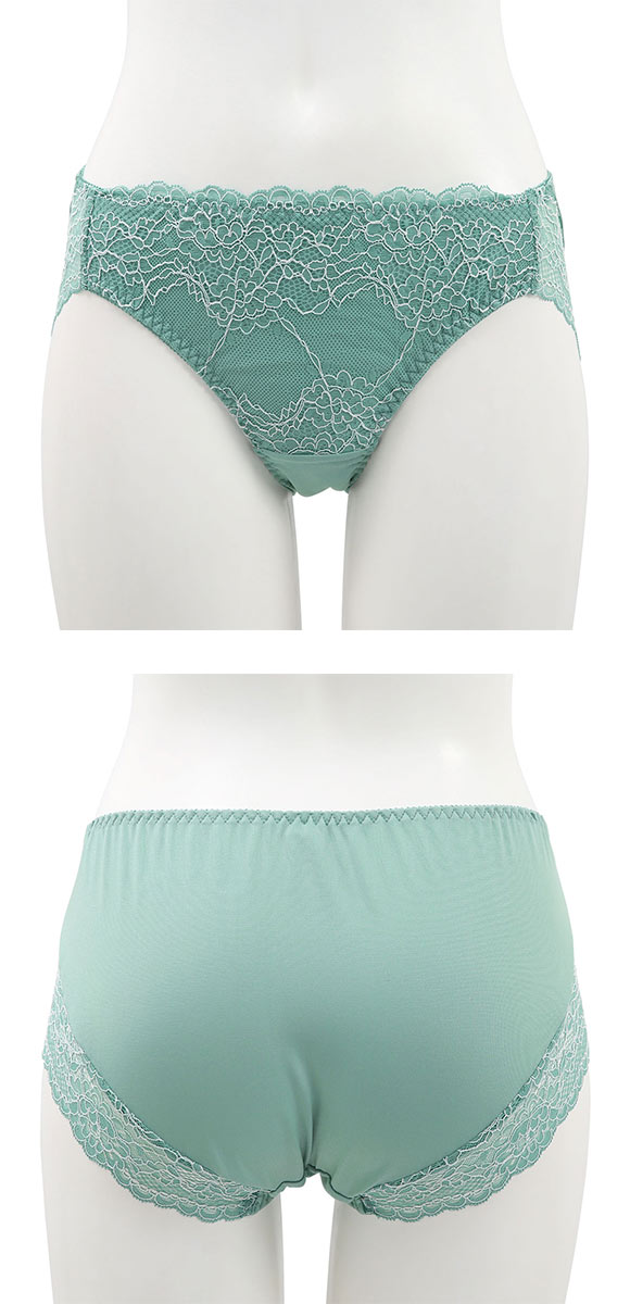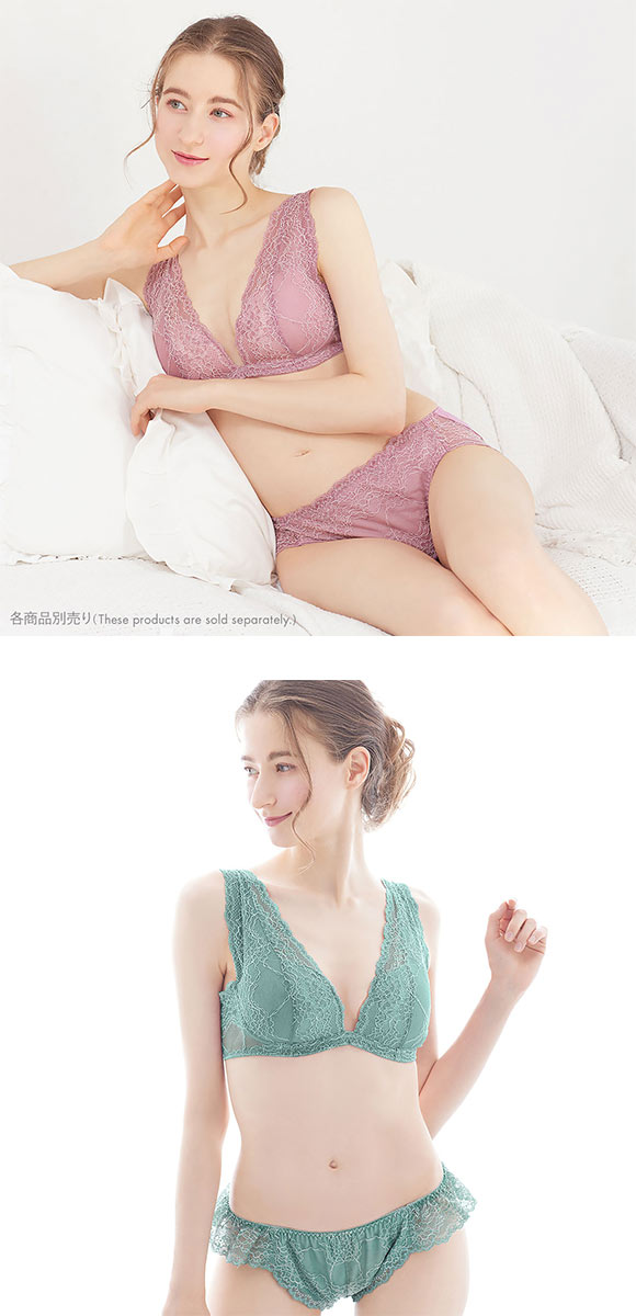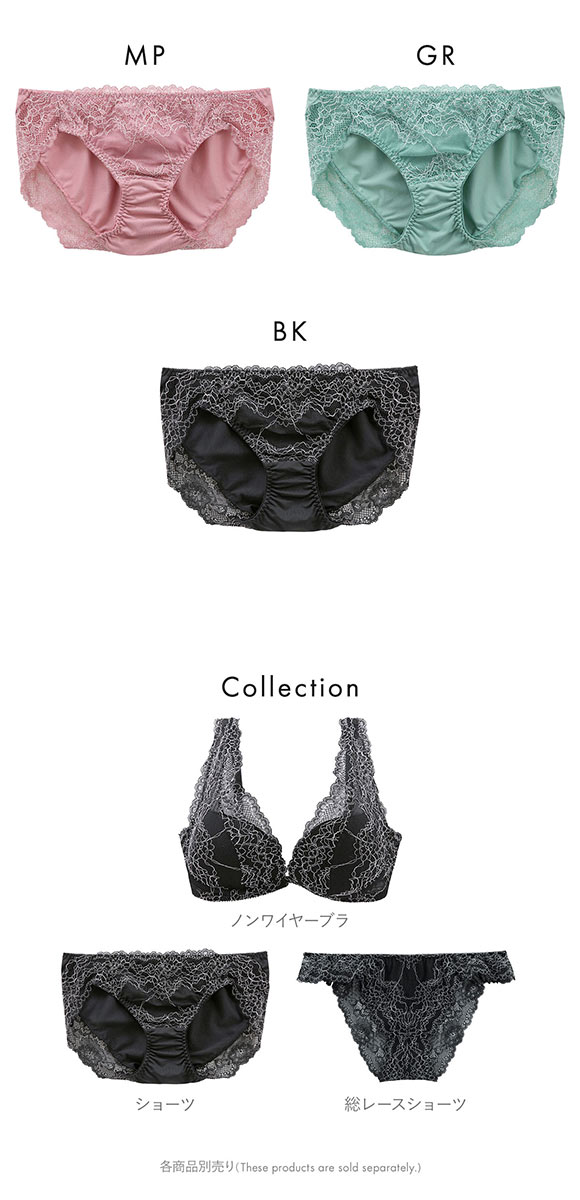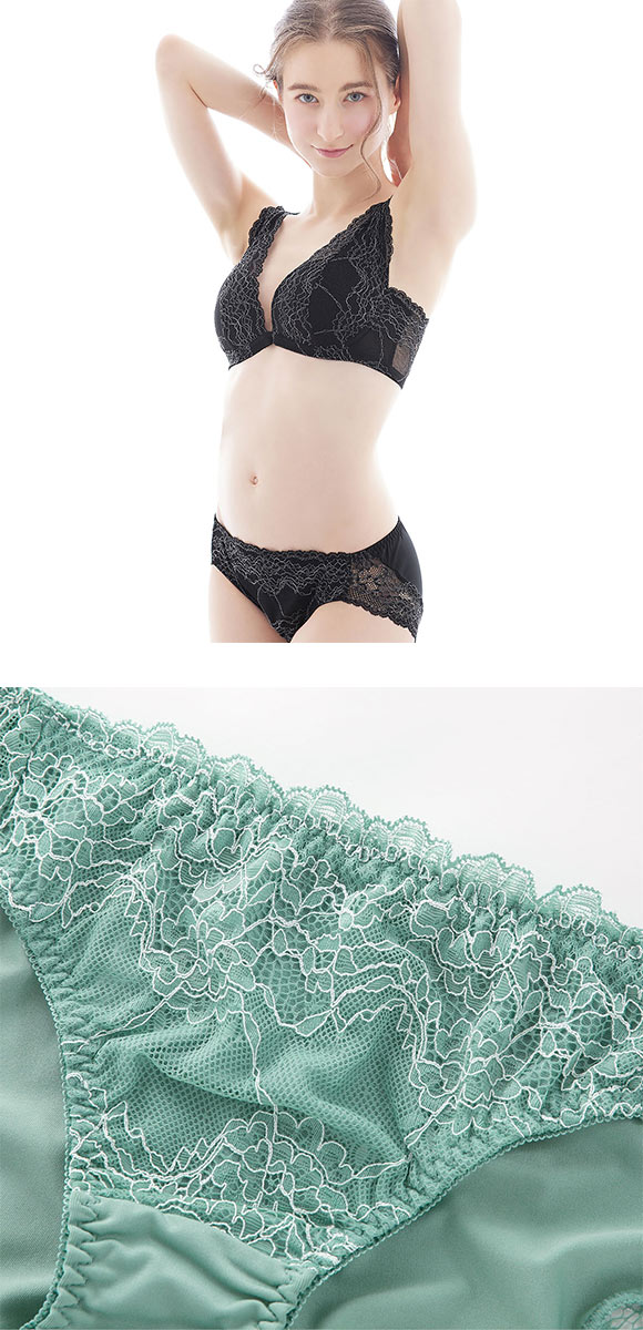 コード糸の柄行が美しい繊細なストレッチレースを使用したレースたっぷりのデザイン。サイドからバック脚口は幅広レース仕様で透け感が美しく、お洋服にもひびきにくく仕上げています。