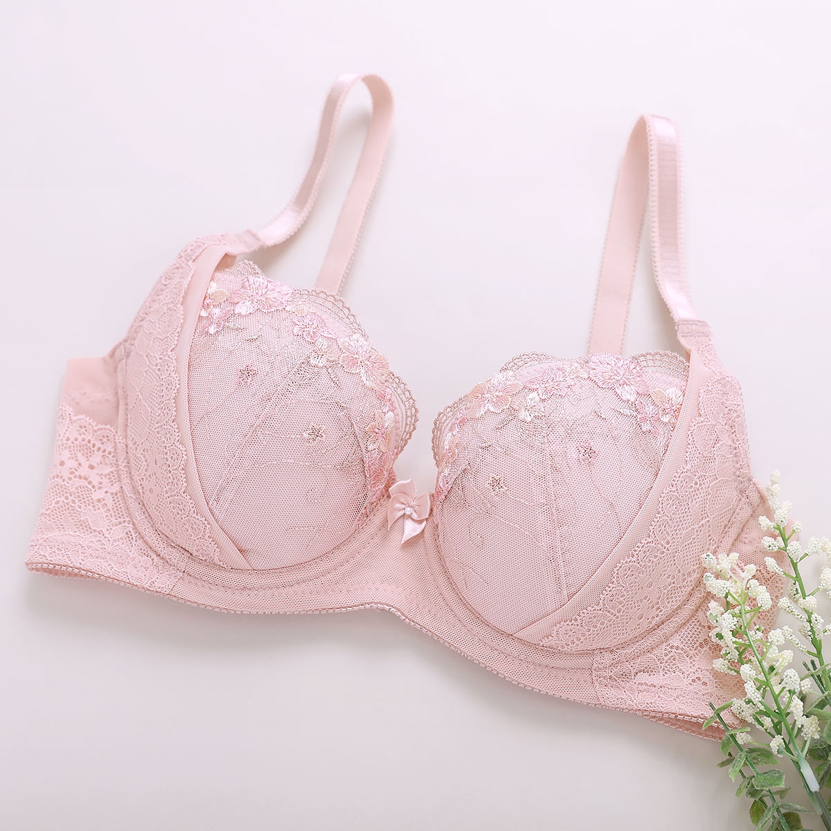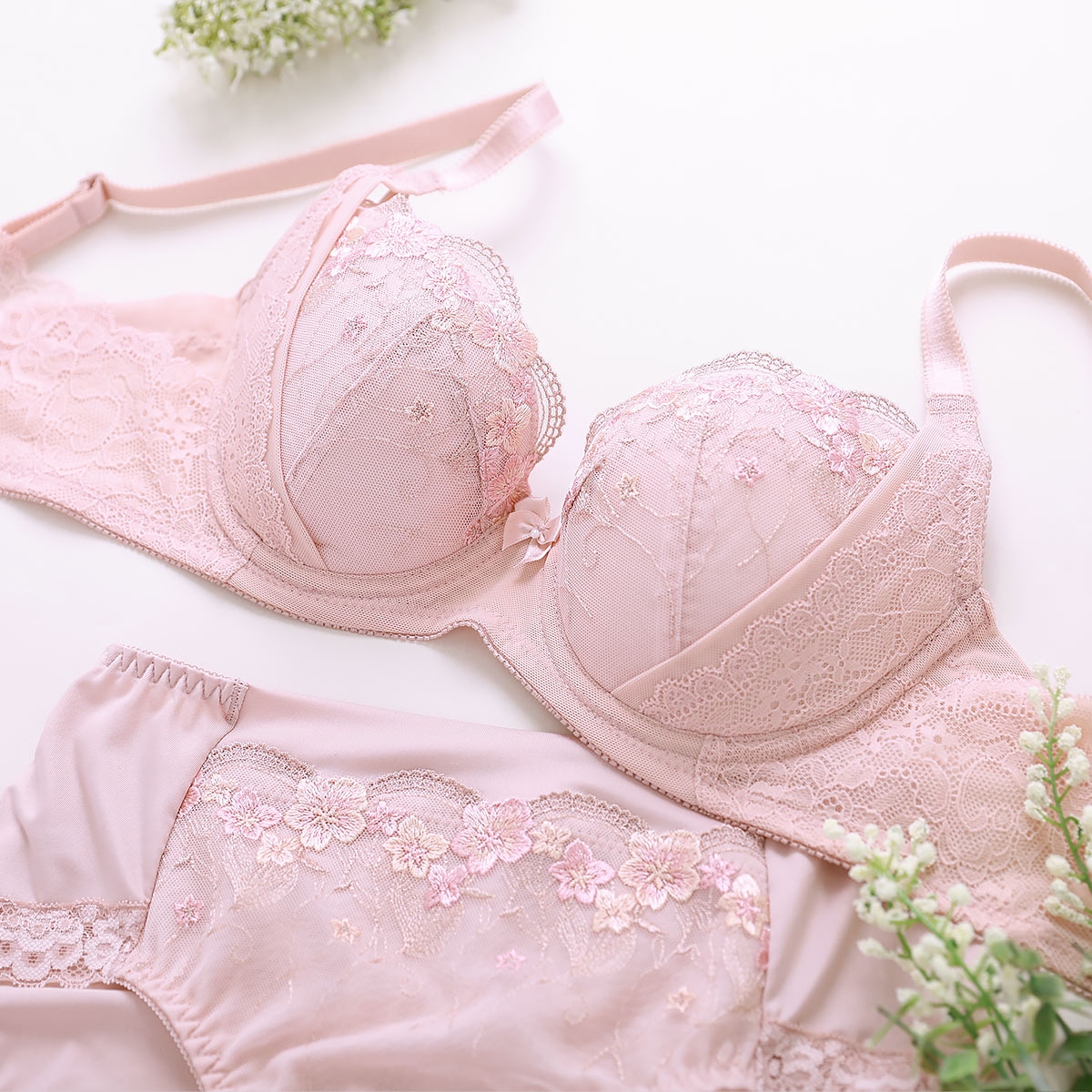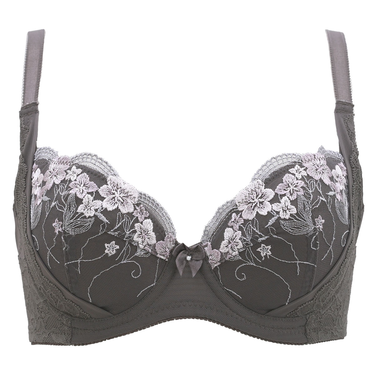 ふっくら胸元で若々しく見せてくれる、美シルエットブラジャーです。エレガントな花柄刺繍をあしらい、上品で洗練されたデザインに仕上げています。