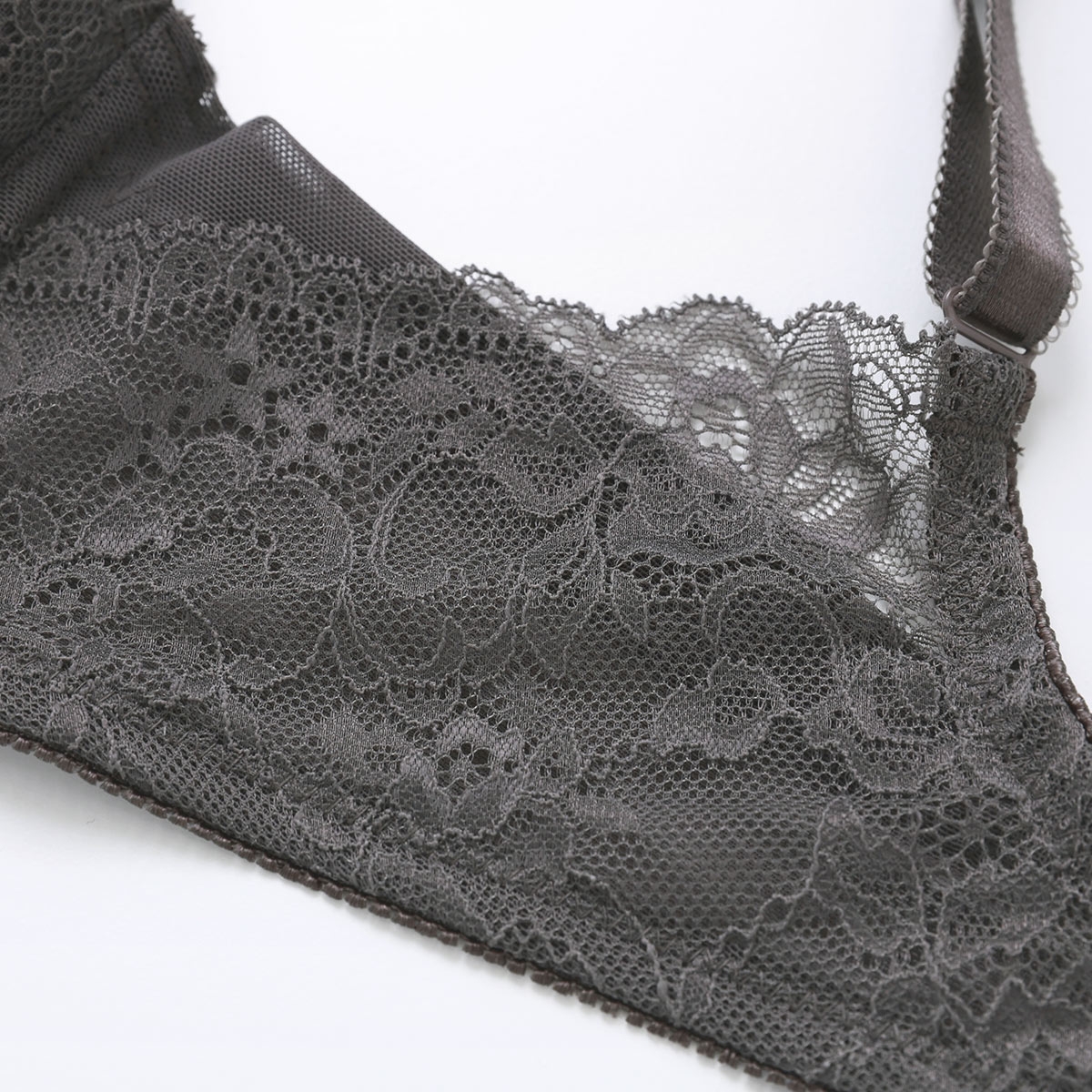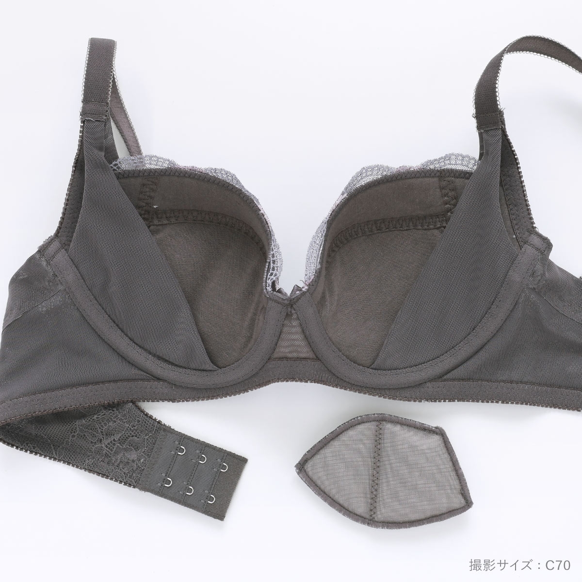 ハンモックのようにバストを持ち上げるカップ内側のサイドパネルと、バストの横広がりを抑えるカップ外側の引き上げパネルでバストを中心に寄せながら、流れて下がりがちなバストを高く持ち上げてキープします。取り外し可能なパッド付きのため、ボリュームの調節が可能です。