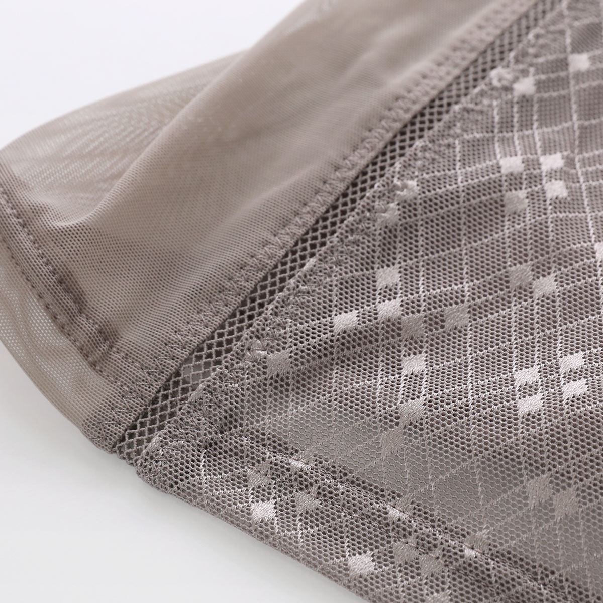 身生地は薄くしなやかで、2WAYに伸縮する肌あたりのやわらかな高通気メッシュ素材を使用。汗の溜まりやすいカップくりをメッシュにすることで、ムレも防止して風通しよく涼しく仕上げています。