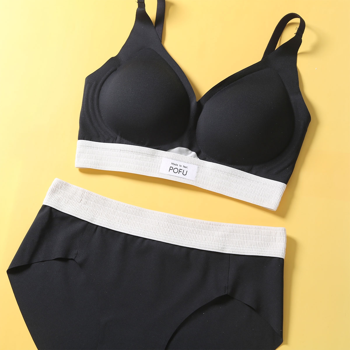 スポーティーでスタイリッシュなシンプルデザインがリラクシーで可愛い【Pofu】ノンワイヤーブラのペアショーツです。ウエストゴムはシャーリングで細部までこだわっています。