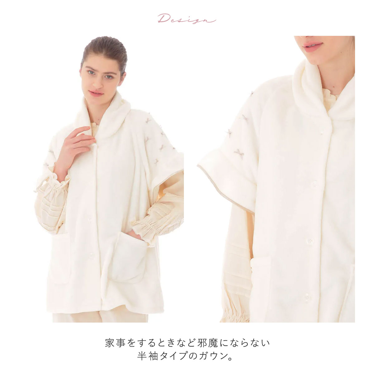 家事をするときなど邪魔にならない半袖タイプのガウン。ミニリボンとパイピングをあしらったフリルのアクセントが可愛らしいデザインです。