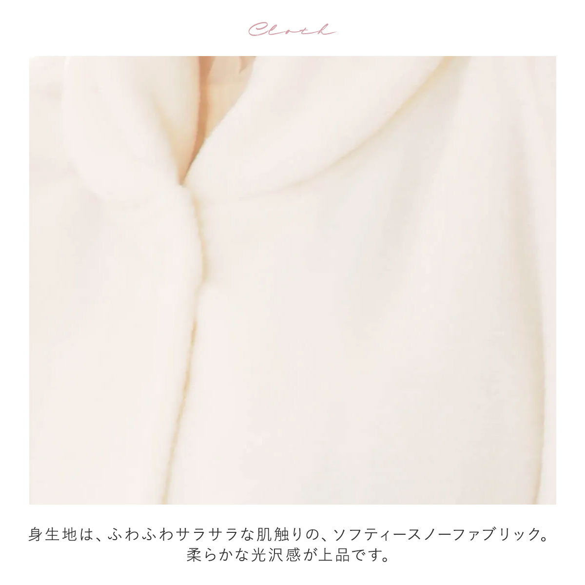 身生地は、ふわふわサラサラな肌触りで、ふんわり暖かくからだを包む、ソフティースノーファブリック。柔らかな光沢感が上品です。