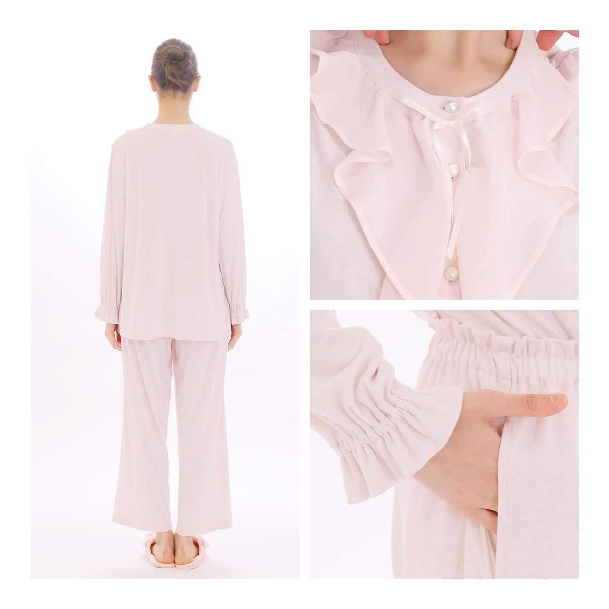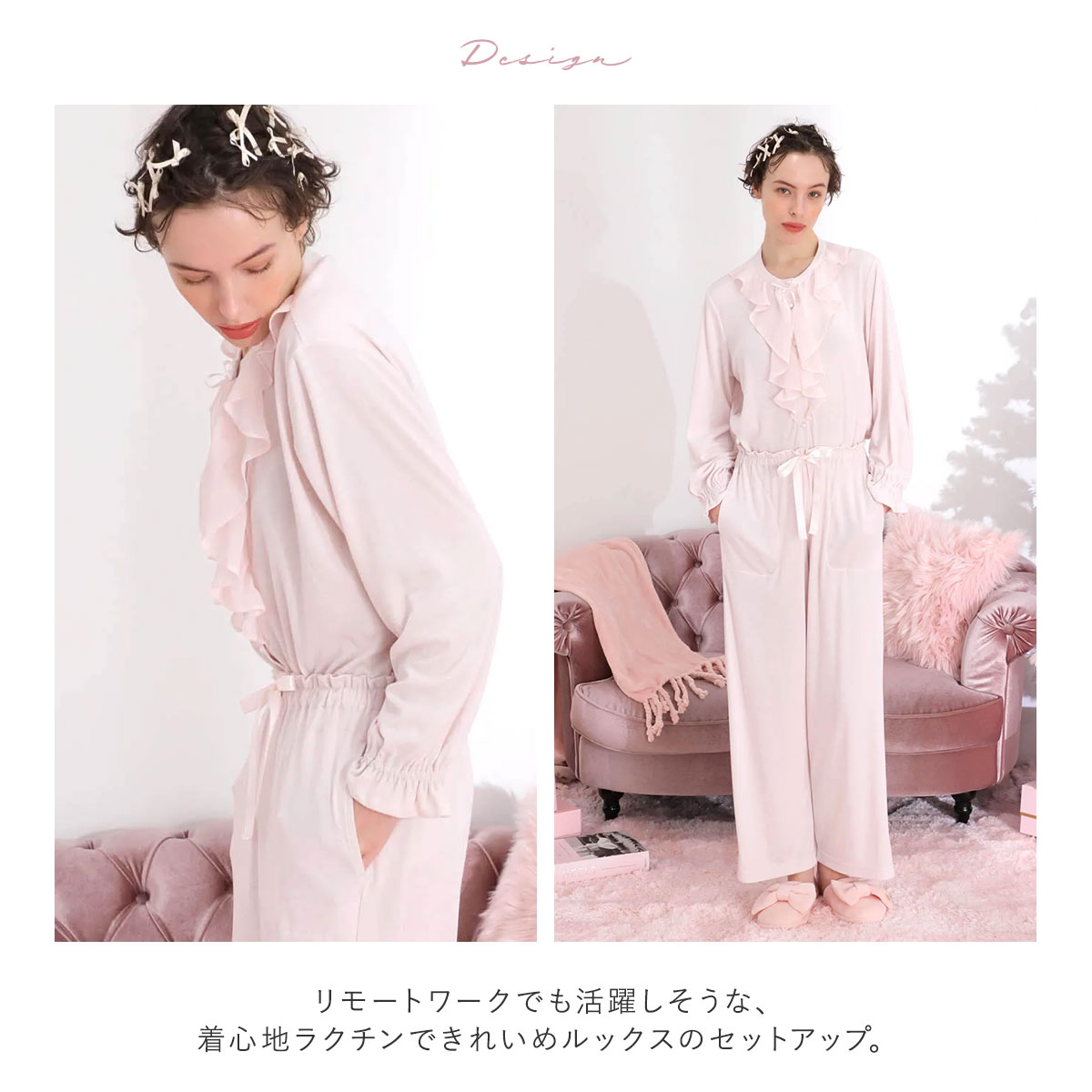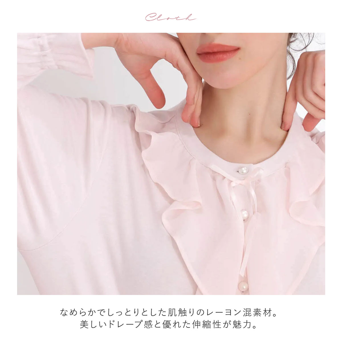 トップスは、胸もとのフリルでエレガントに。首元のサテンリボンや、上品な光沢を放つパールボタンなど、ディテールまでこだわったデザインです。