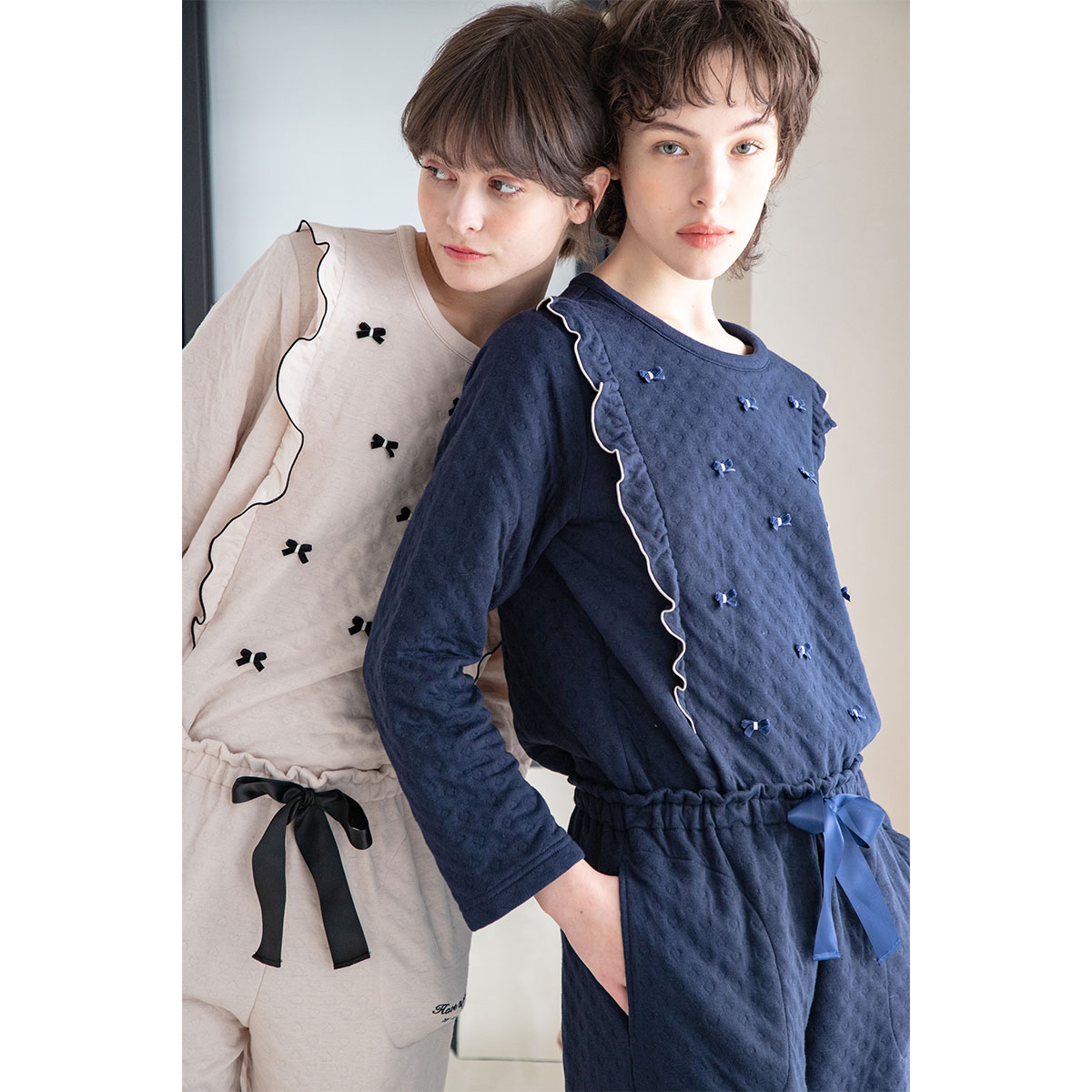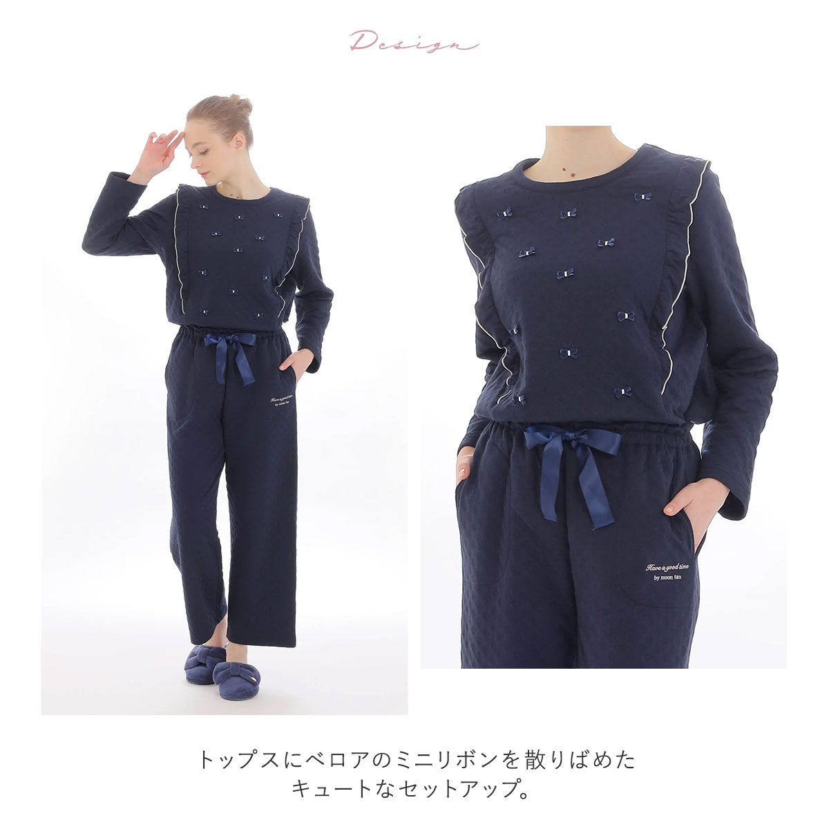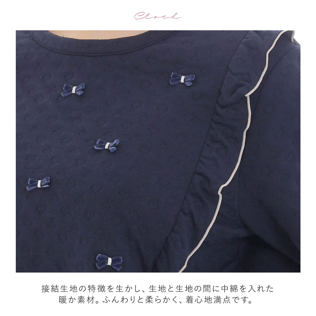トップスはベロアのミニリボンを散りばめたキュートなデザイン。サイドには配色のメロウを効かせたフリルをあしらい、華やかさをプラスしています。