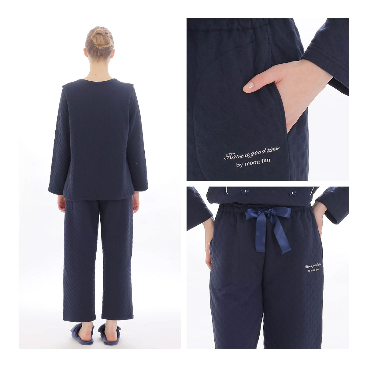 接結生地の特徴を生かし、生地と生地の間に中綿を入れた暖か素材で仕立てたセットアップ。ふんわりと柔らかく、着心地満点です。生地の表側と肌にあたる面は、お肌に優しい綿100%素材を使用しています。