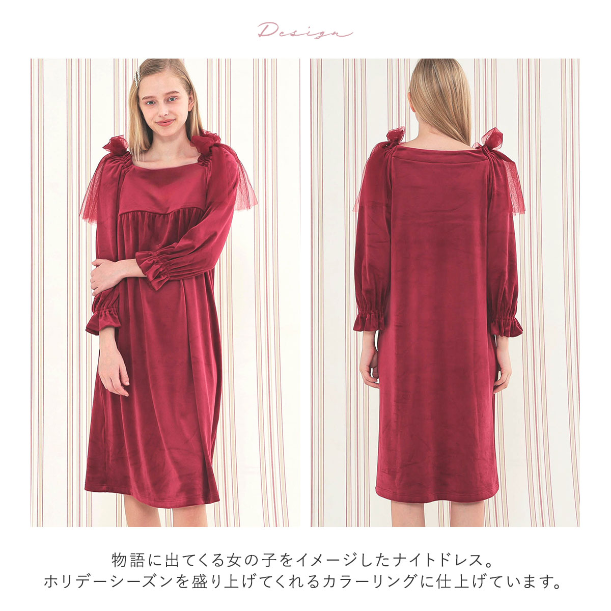 物語に出てくる女の子をイメージしたナイトドレス。ホリデーシーズンを盛り上げてくれるカラーリングに仕上げています。