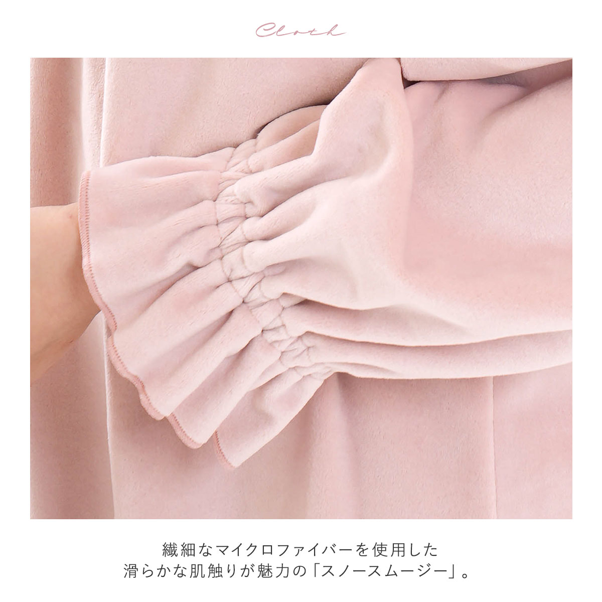 身生地は、繊細なマイクロファイバーを使用した滑らかな肌触りが魅力の「スノースムージー」。保温性が高く暖かで、ストレッチ性にも優れています。タンブラー乾燥可能でしわになりにくく、速乾性を持ち、お手入れ簡単なのも嬉しいポイント。