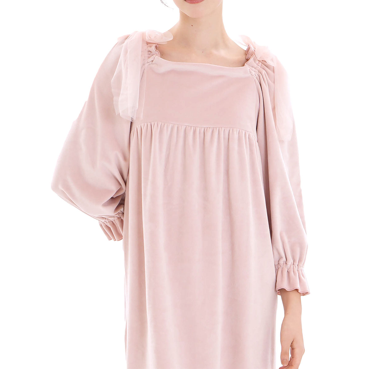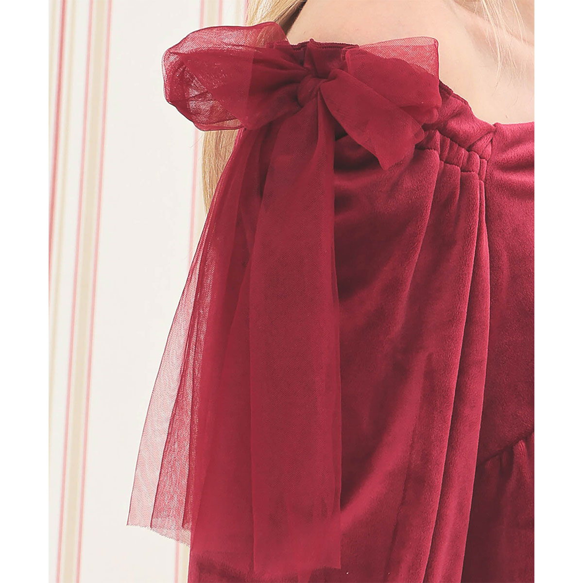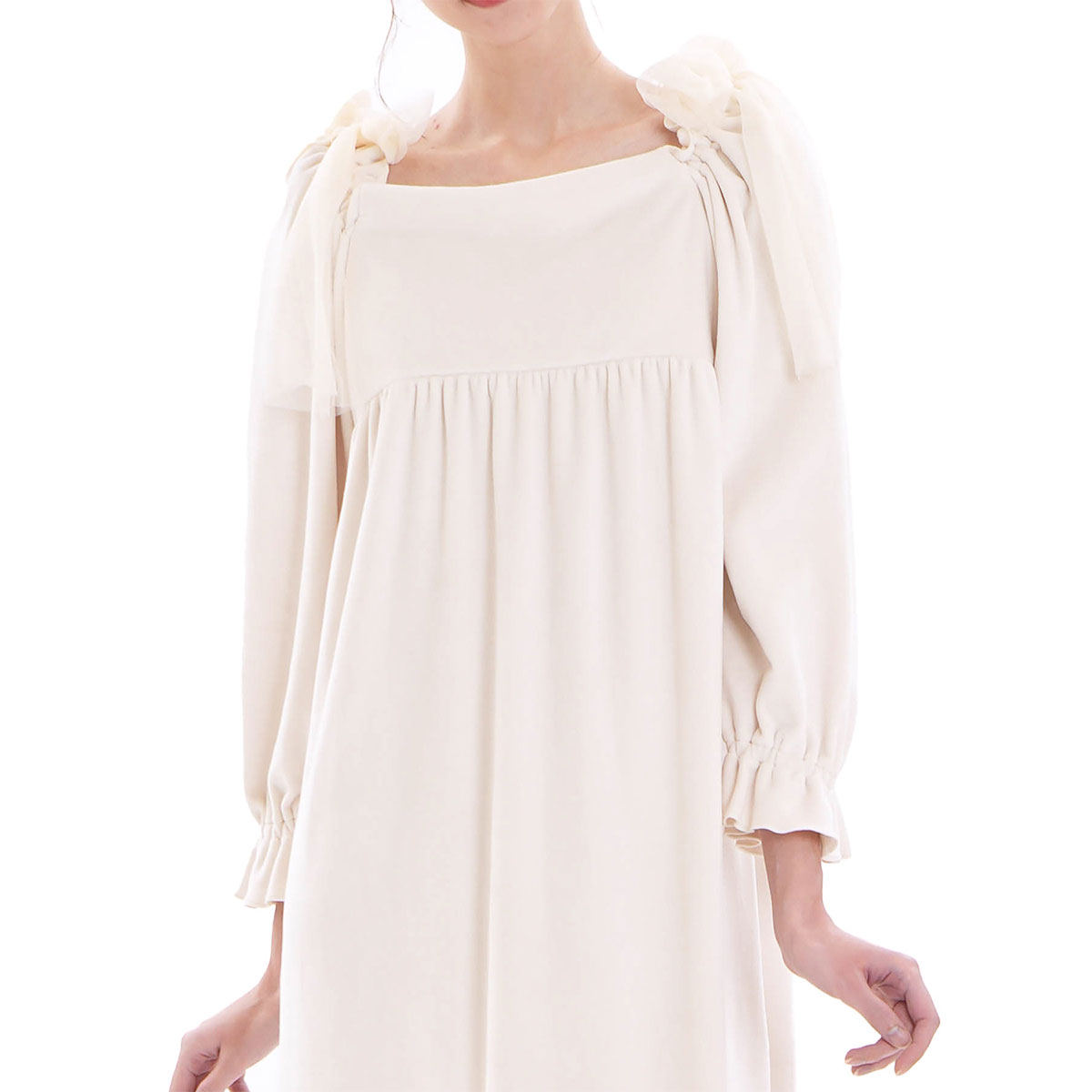 肩の大きなチュールリボンは、顔まわりを明るく華やかな印象に演出してくれます。