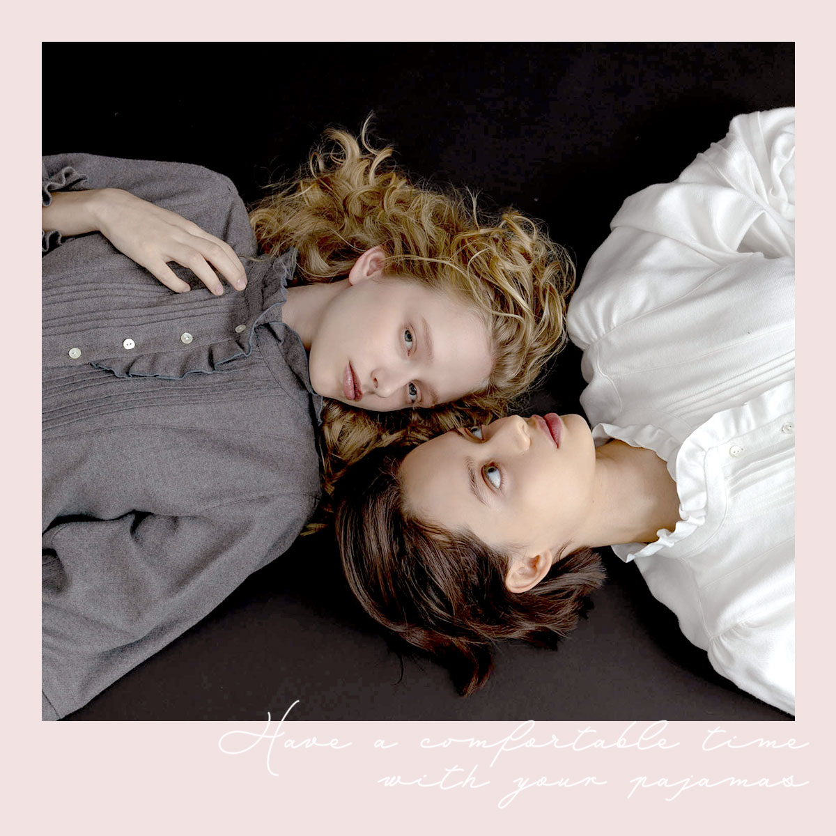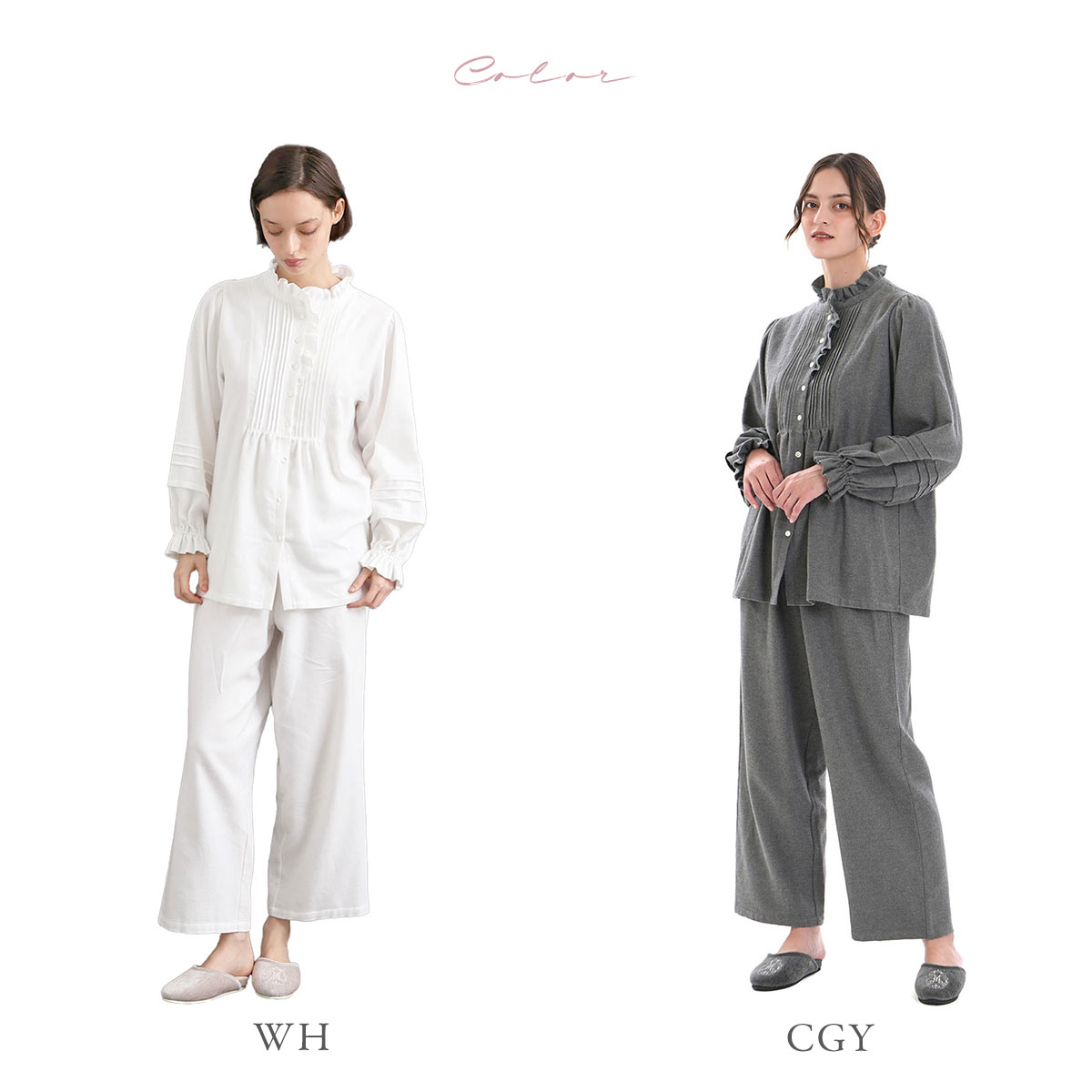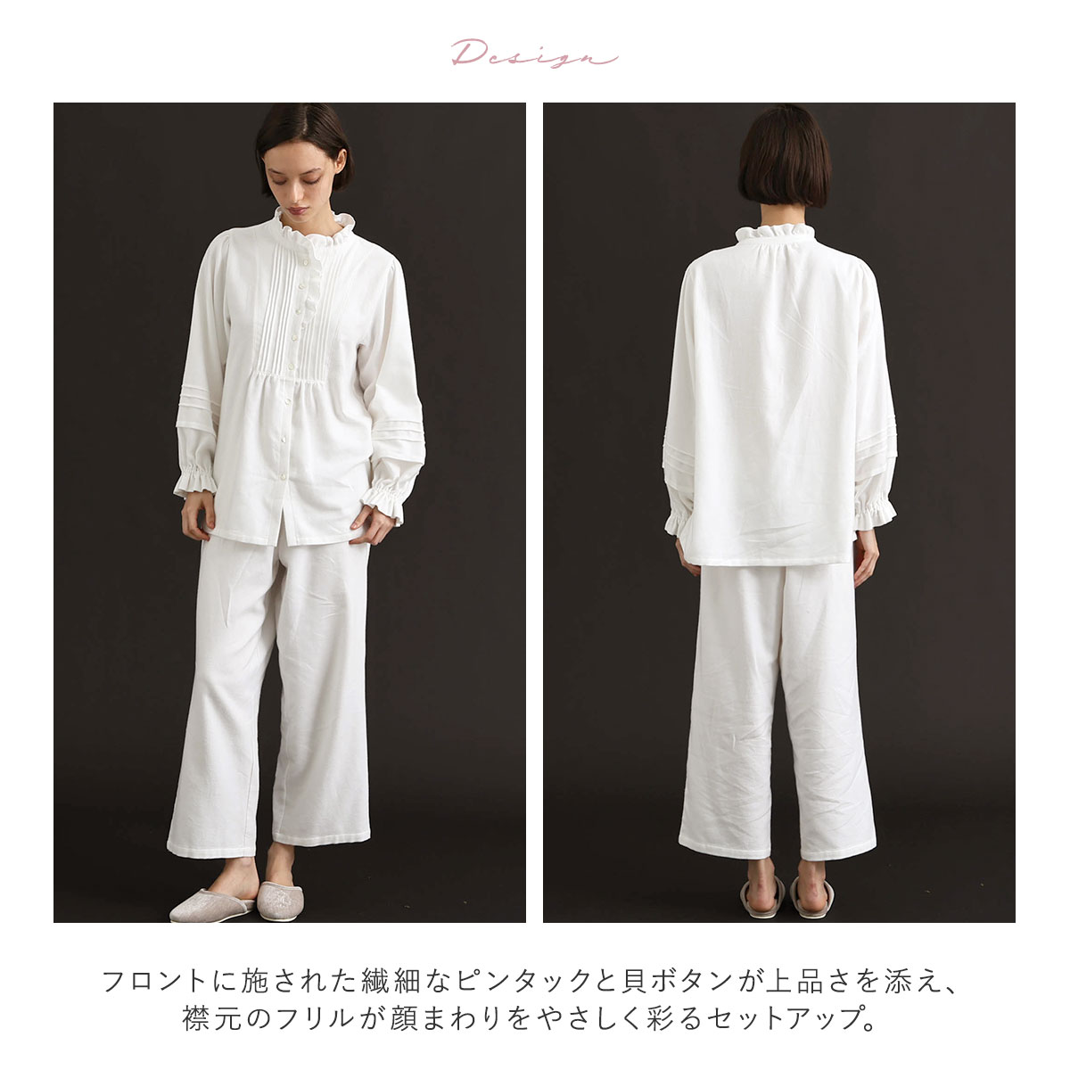 フロントに施された繊細なピンタックと貝ボタンが上品さを添え、襟元のフリルが顔まわりをやさしく彩るセットアップ。