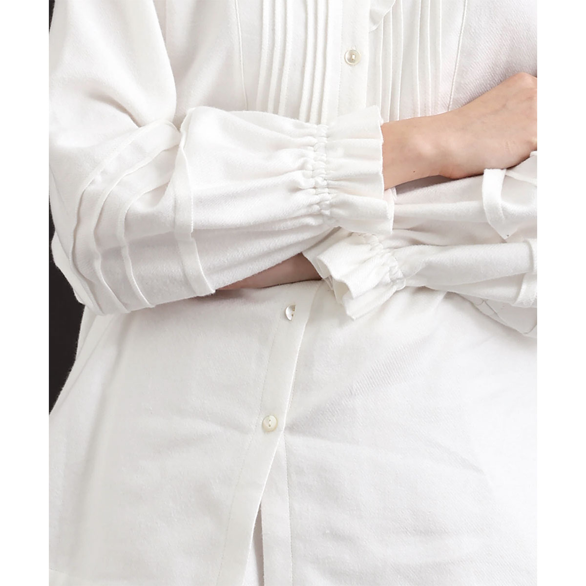 首にほどよく立ち上がるフリルは、ボタン位置を下げる事でリラックス感を出しているので、締め付け感なくご着用いただけます。