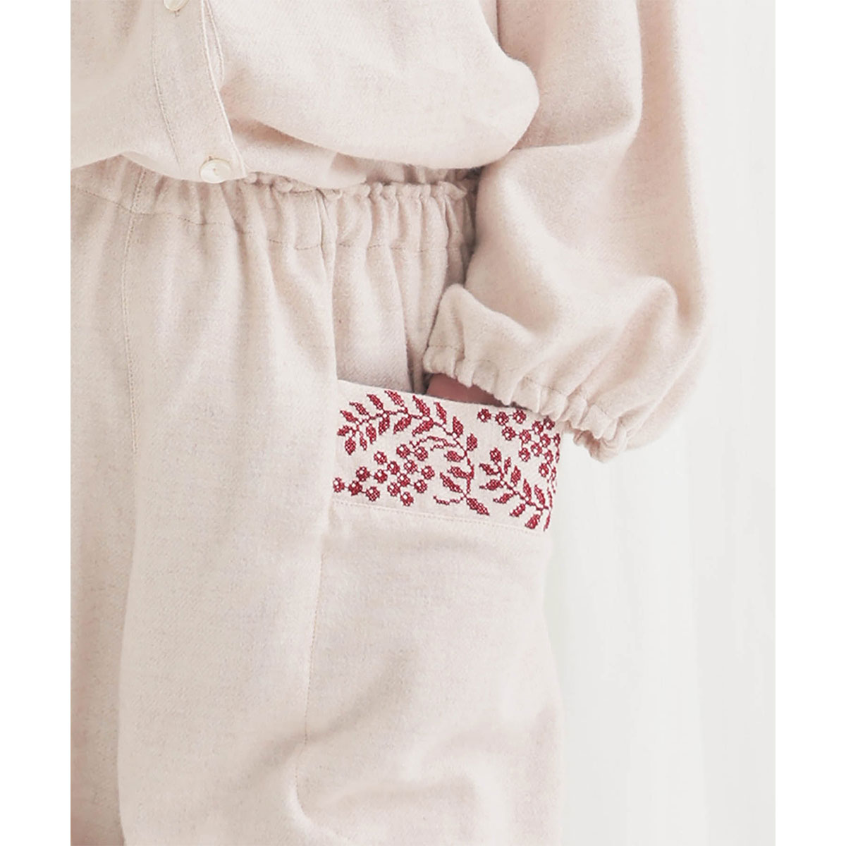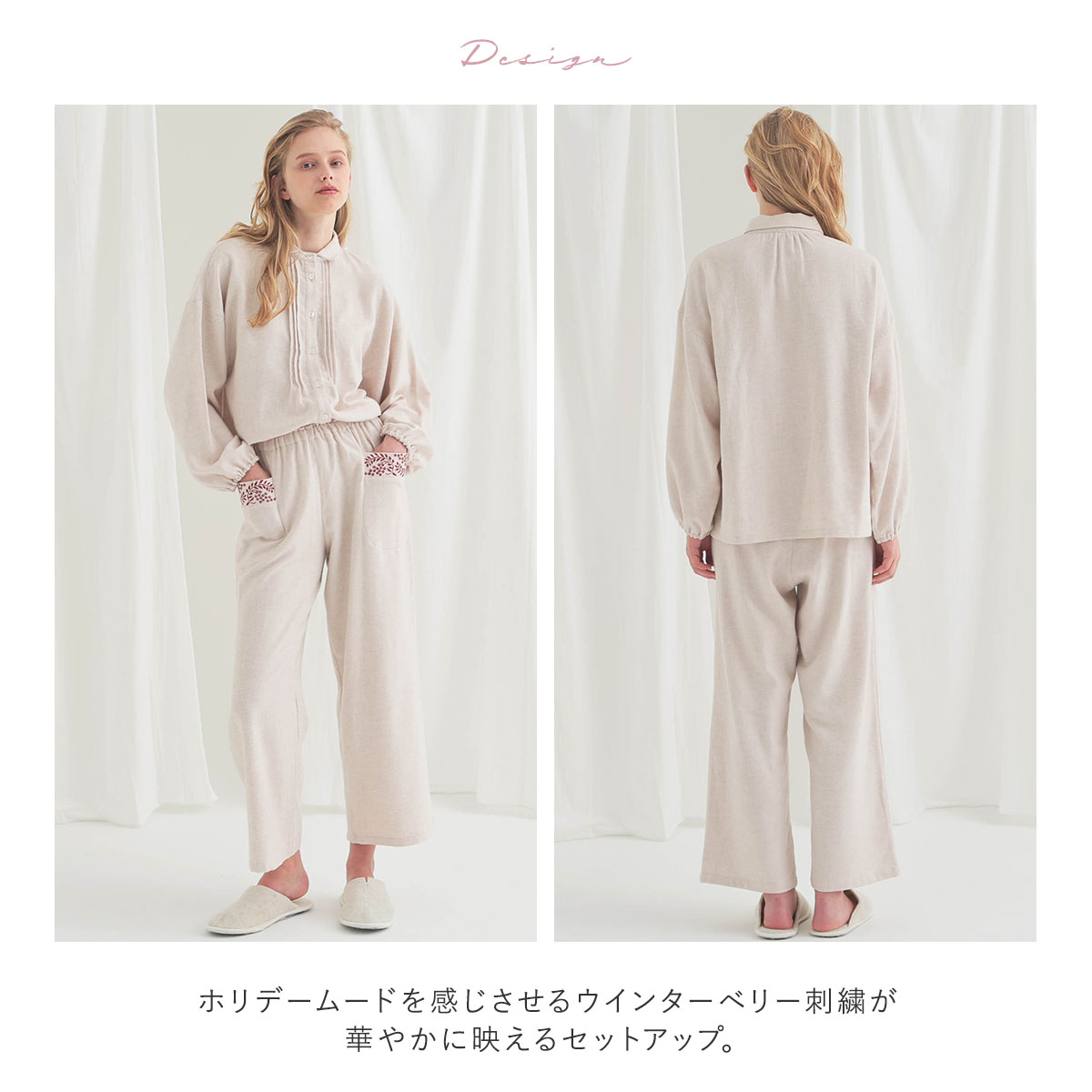 ホリデームードを感じさせるウインターベリー刺繍が華やかに映えるセットアップ。刺繍はクラシックなクロスステッチ手法を取り入れ表現しています。