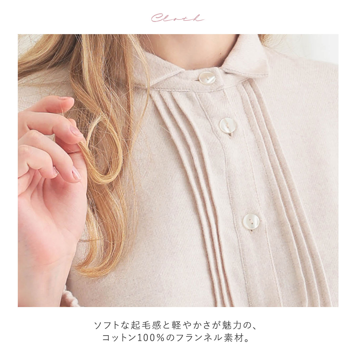 トップスは、小ぶりな衿とオーバーすぎないシルエットで、シンプルながらもきちんと感のある印象に。フロントに施したピンタックが、さりげない立体感をプラスしています。