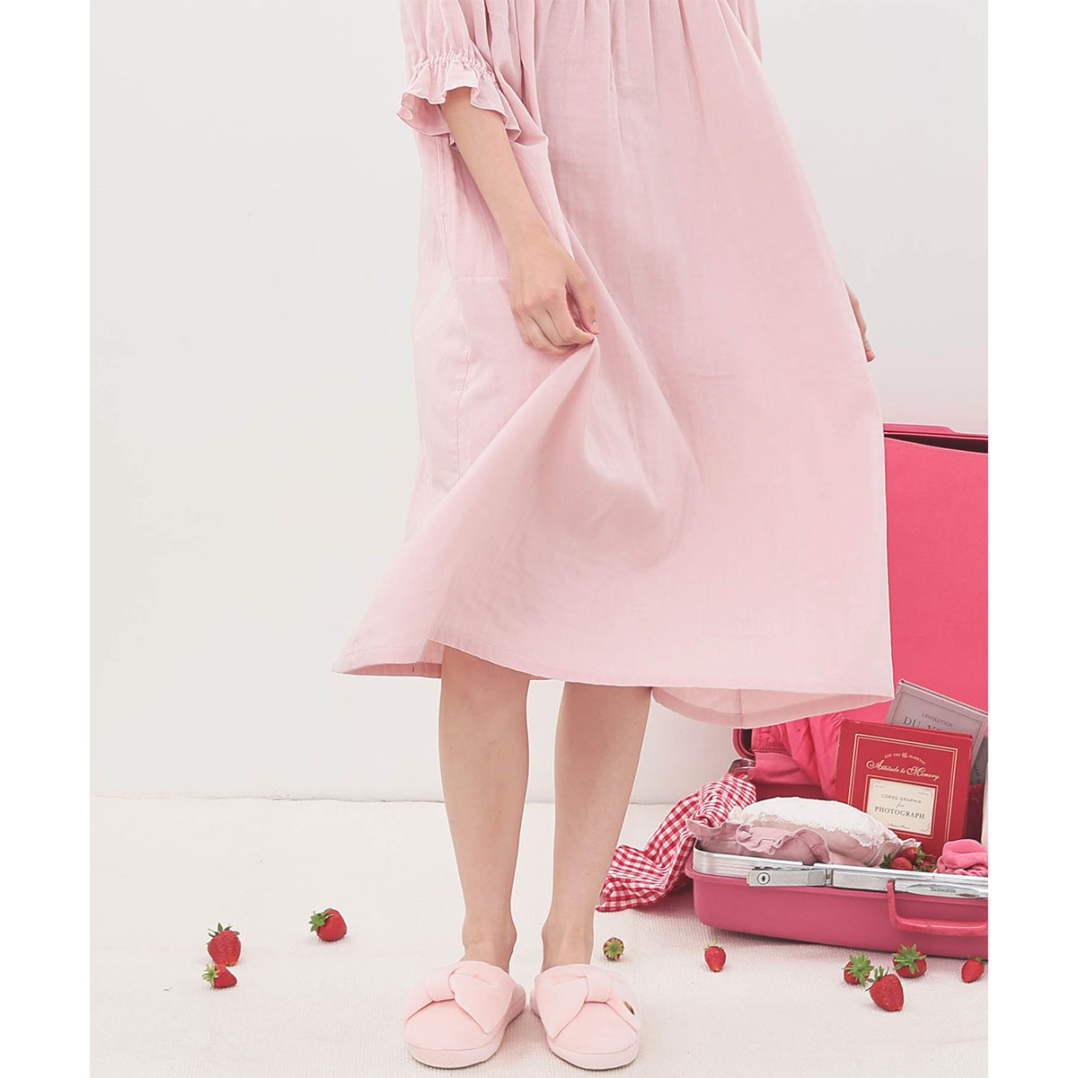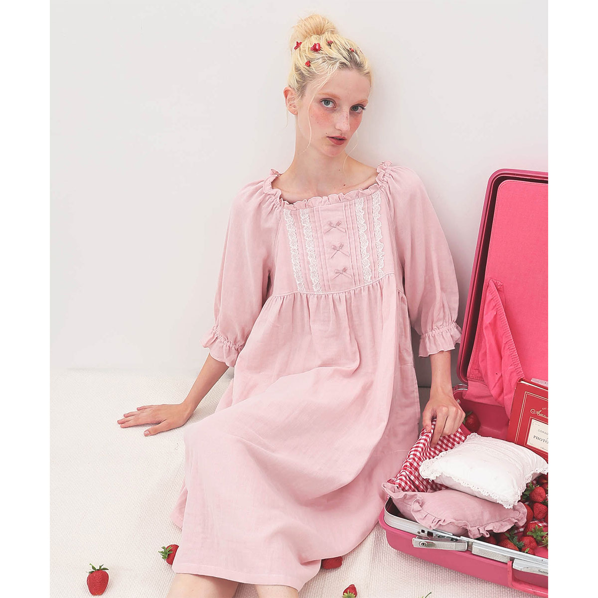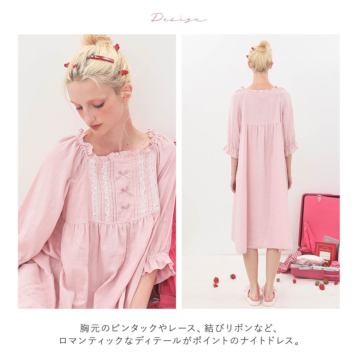 胸元のピンタックやレース、結びリボンなど、ロマンティックなディテールがポイントのナイトドレス。