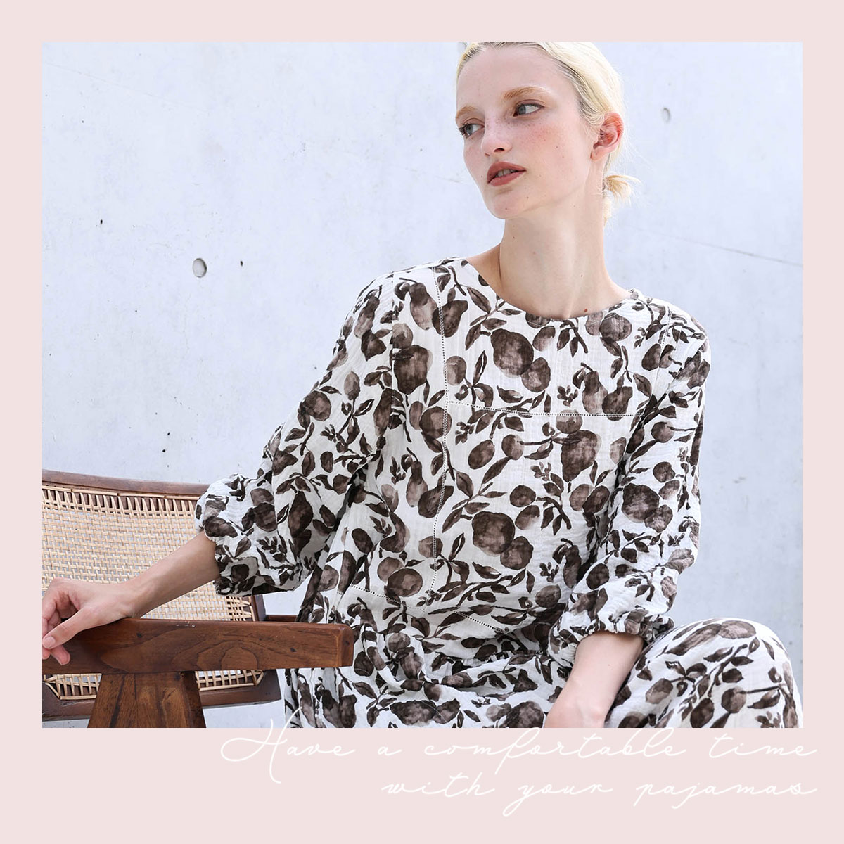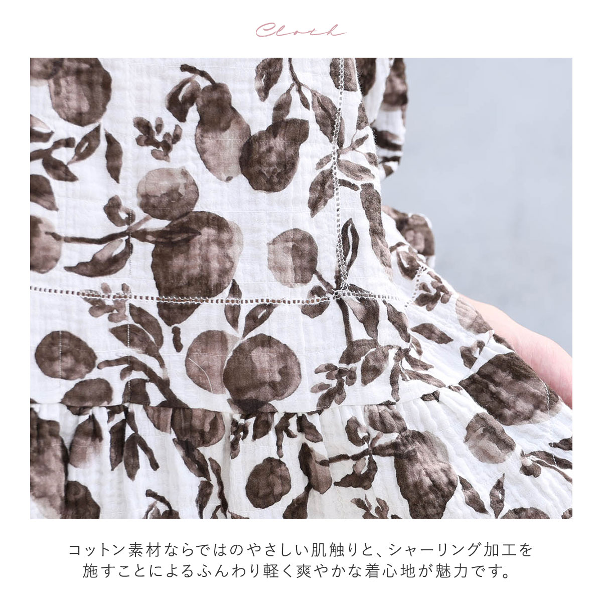 コットン素材ならではのやさしい肌触りと、シャーリング加工を施すことによるふんわり軽く爽やかな着心地が魅力です。