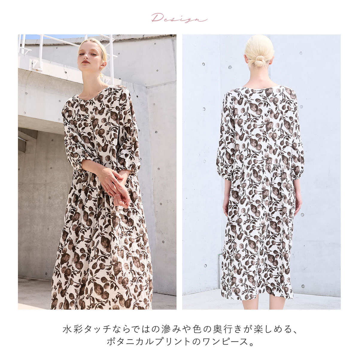 水彩タッチならではの滲みや色の奥行きが楽しめる、ボタニカルプリントのワンピース。