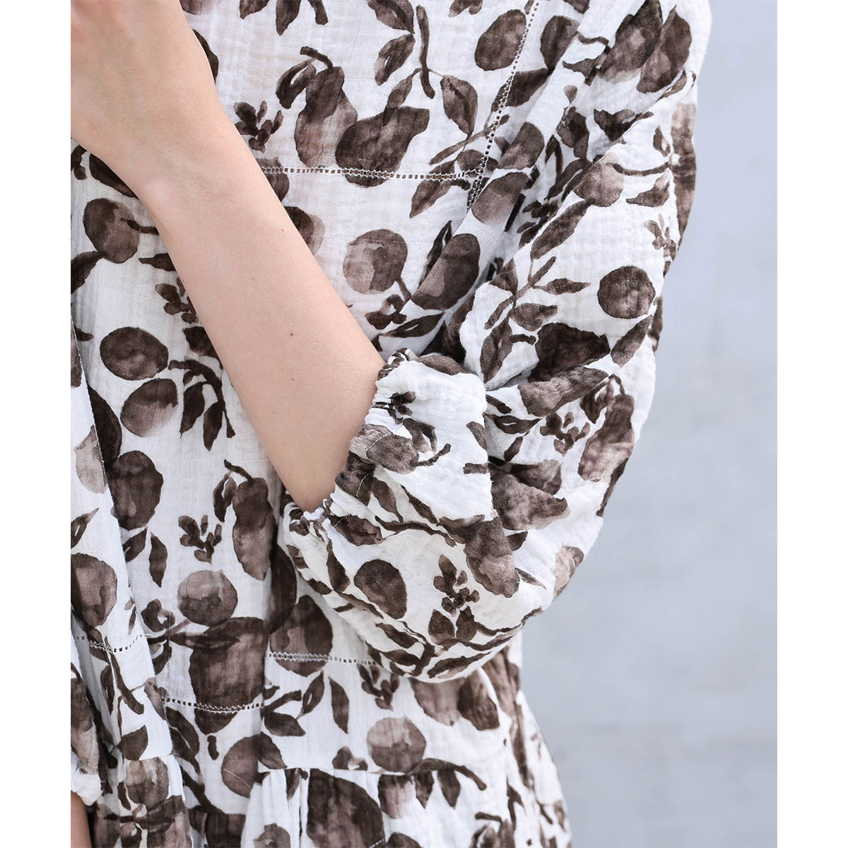 軽く爽やかな着心地★水彩ボタニカル柄シャーリングガーゼドレス