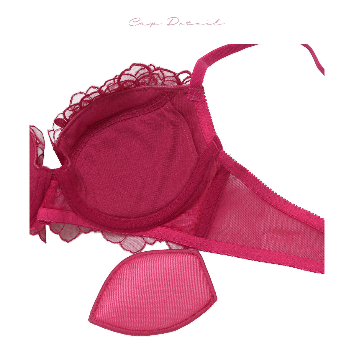 カップ部分は高さあるシャープなシルエットを作るパターン設計。取り外し可能なパッドつきで、バストボリュームを調整できます。