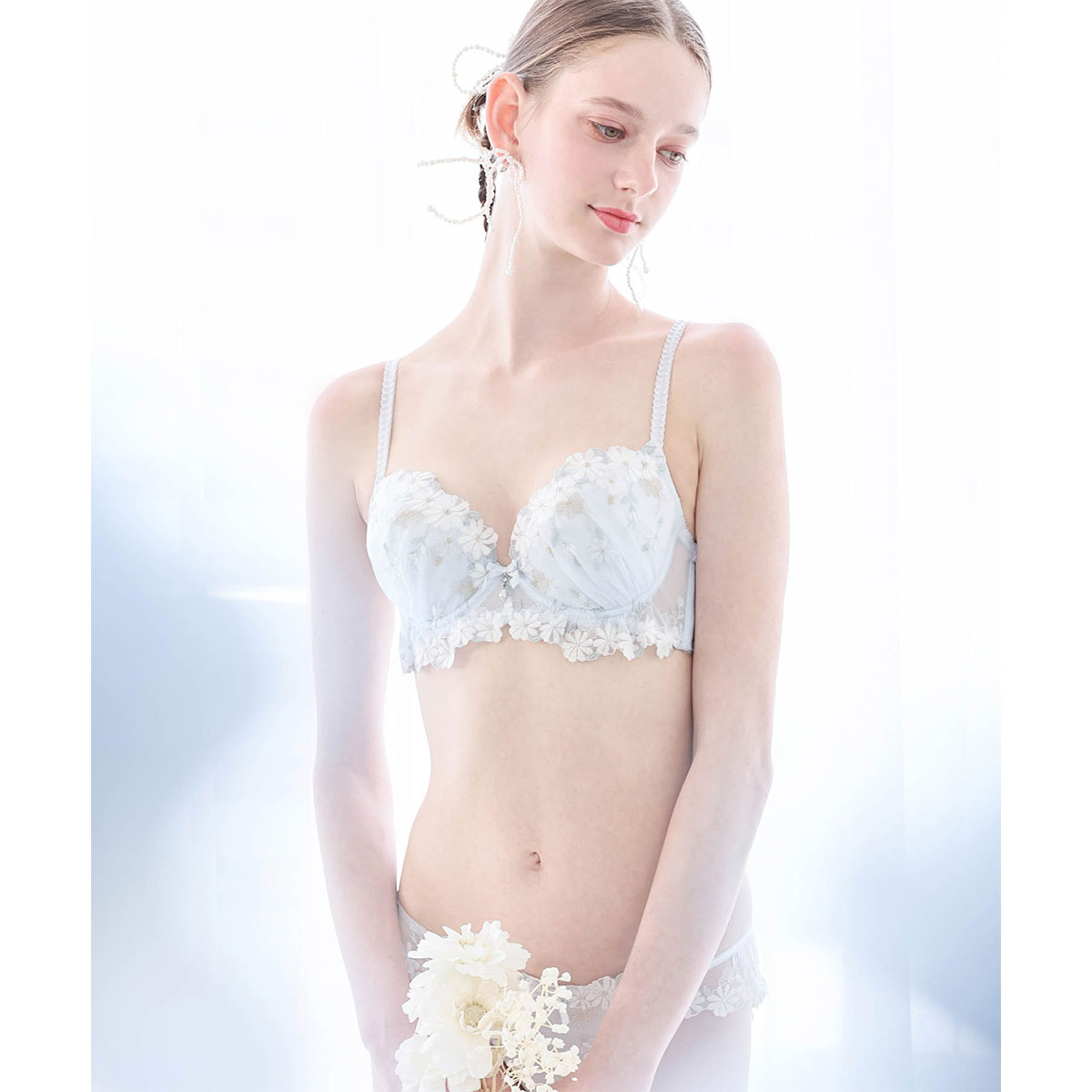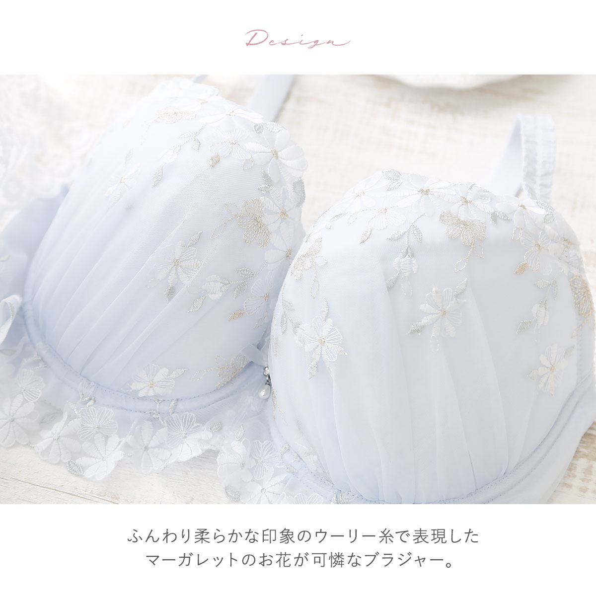 ふんわり柔らかな印象のウーリー糸で表現したマーガレットのお花が可憐なブラジャー。甘いカラーリングが刺しゅうの可愛らしさを引き立てています。