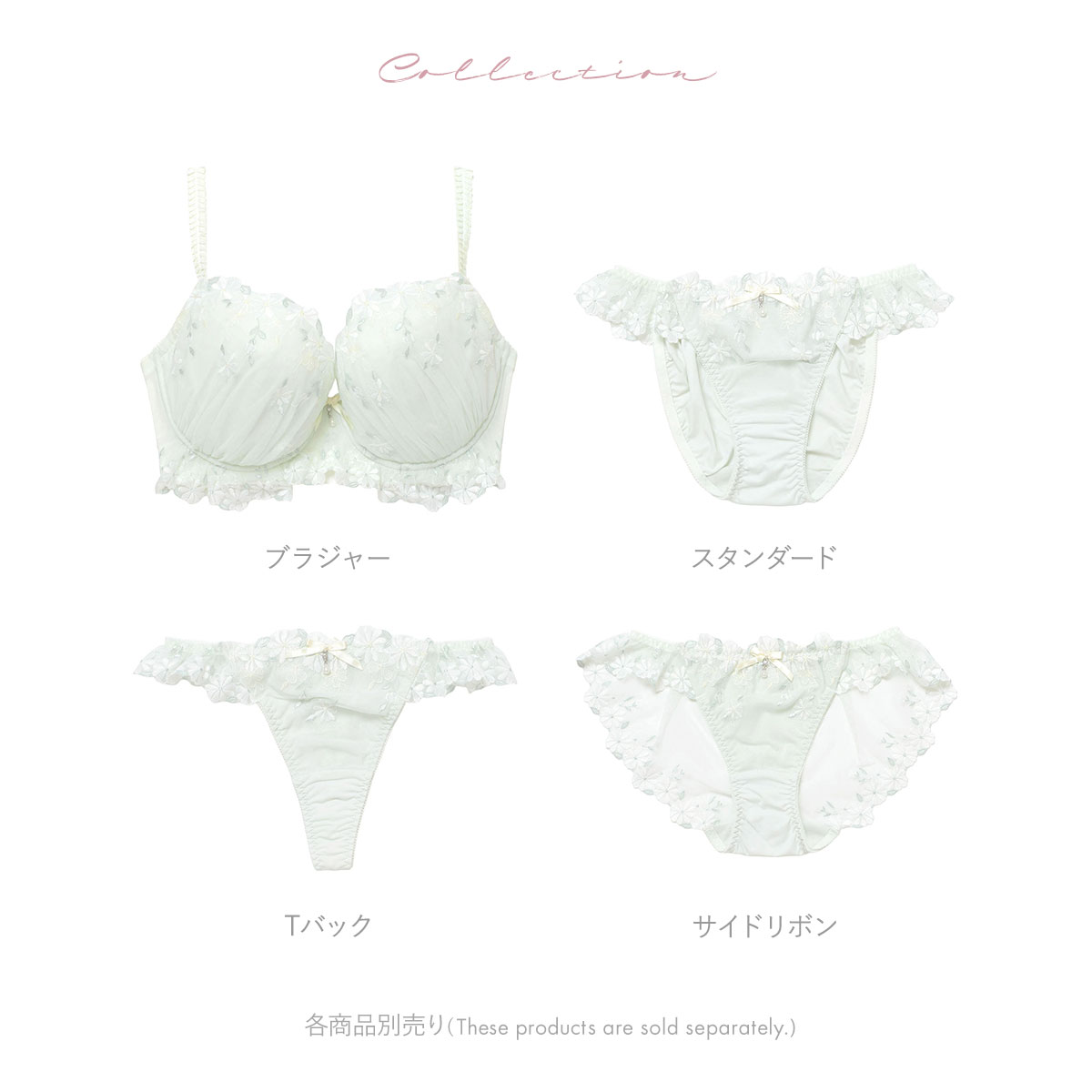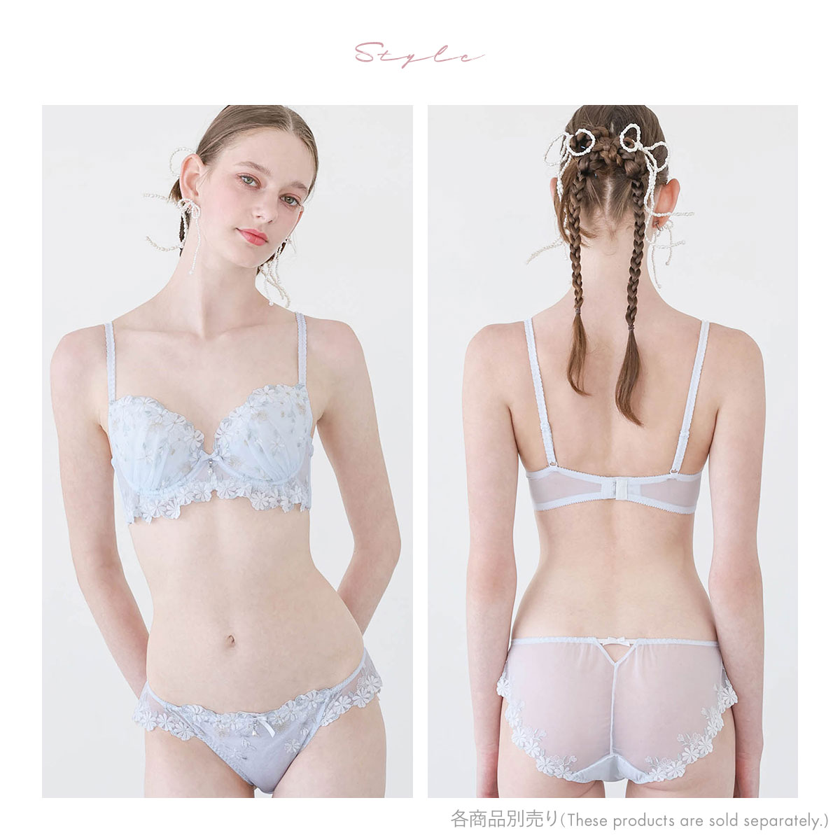 | 仕 様 | ・ホックの数:3段3列 ・3/4カップ ・パッド取外し:可能 ・肩紐取外し:不可 ・ワイヤー入り ・サイドボーン:あり ※アクセサリーは取り外しできません。 |