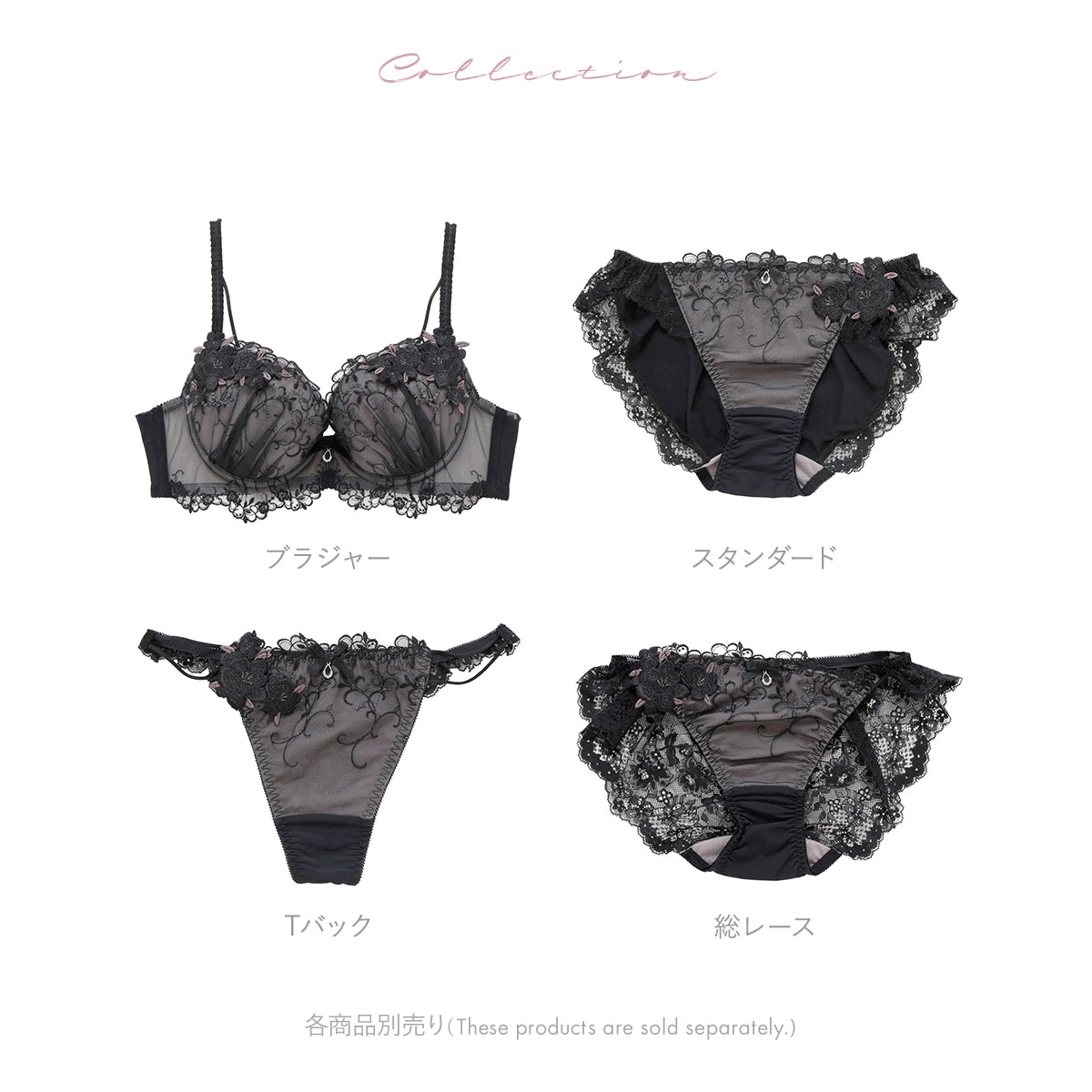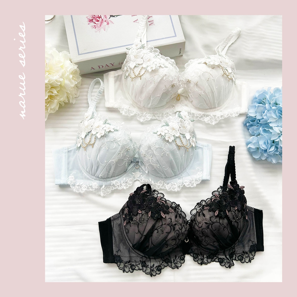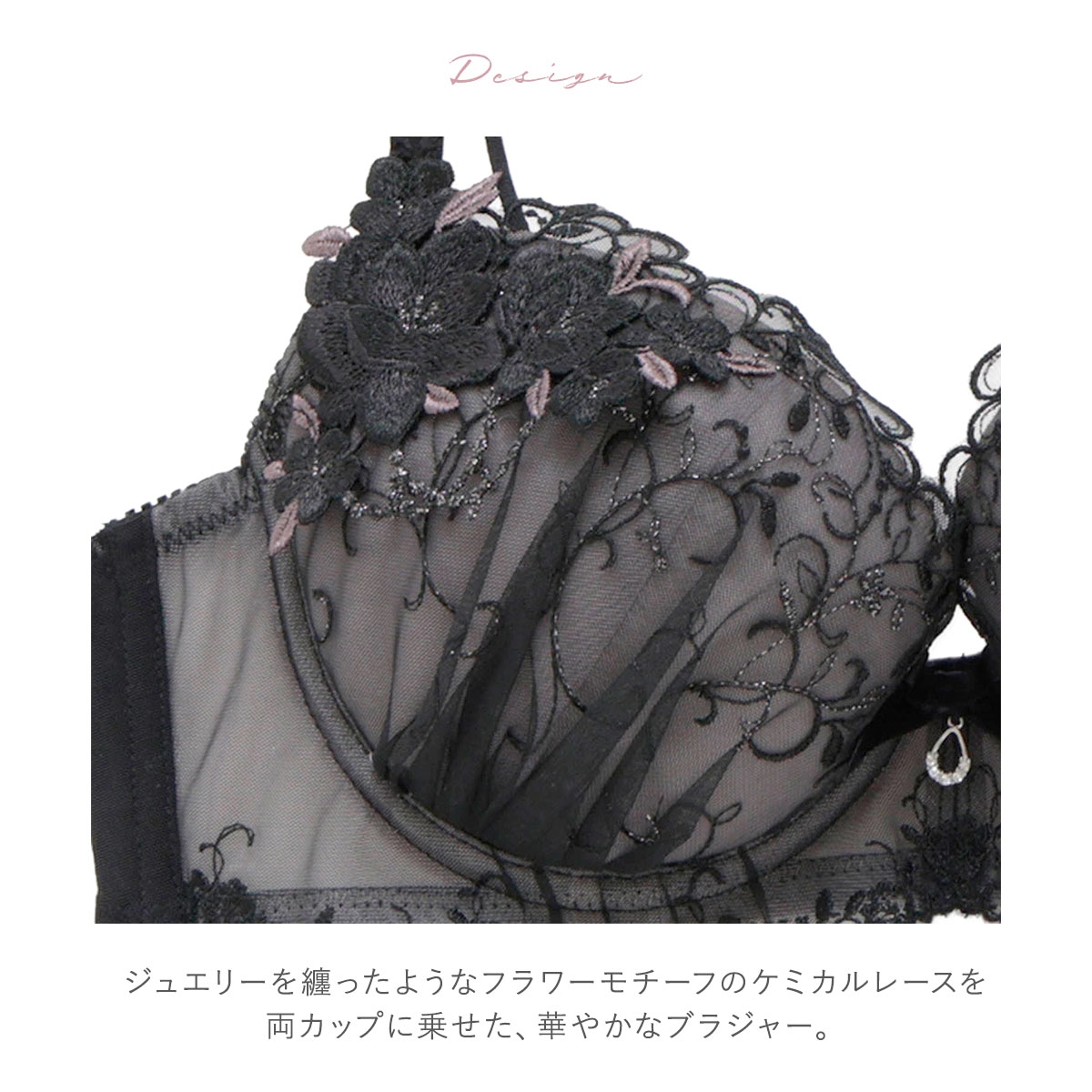 ジュエリーを纏ったようなフラワーモチーフのケミカルレースを両カップに乗せた、華やかなブラジャー。