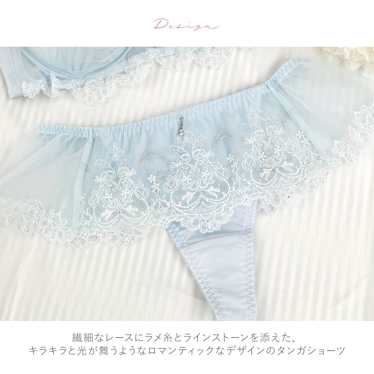 繊細なレースにラメ糸とラインストーンを添えた、キラキラと光が舞うようなロマンティックなデザインのタンガショーツ。