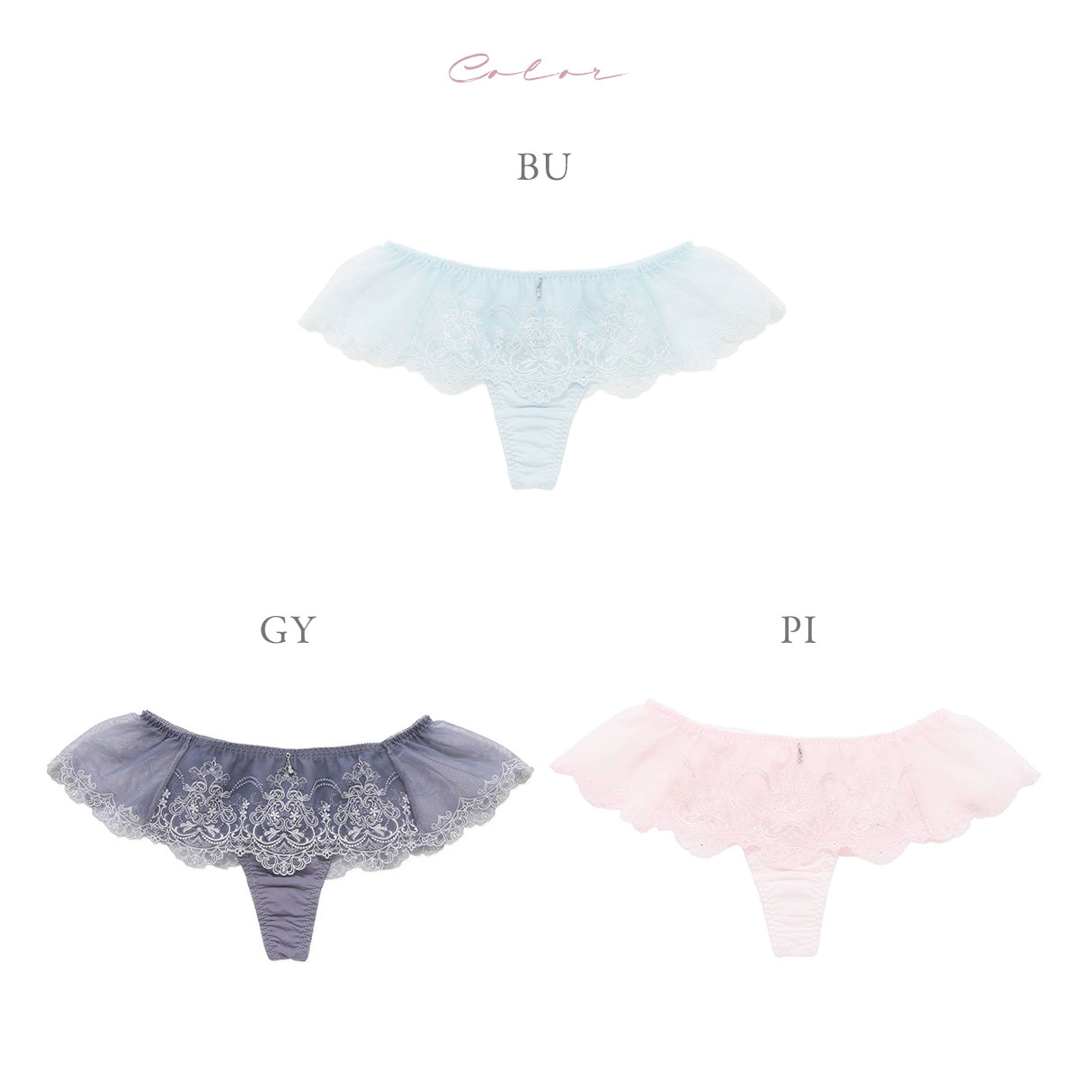 カラーBU-ブルー、GY-グレー、PI-ピンク