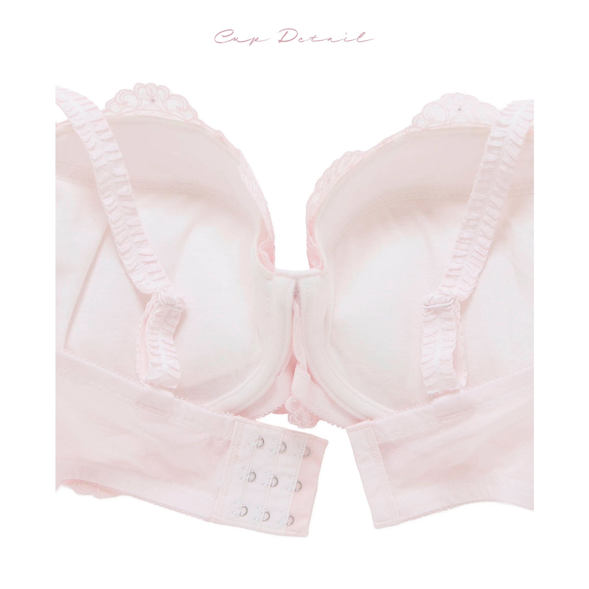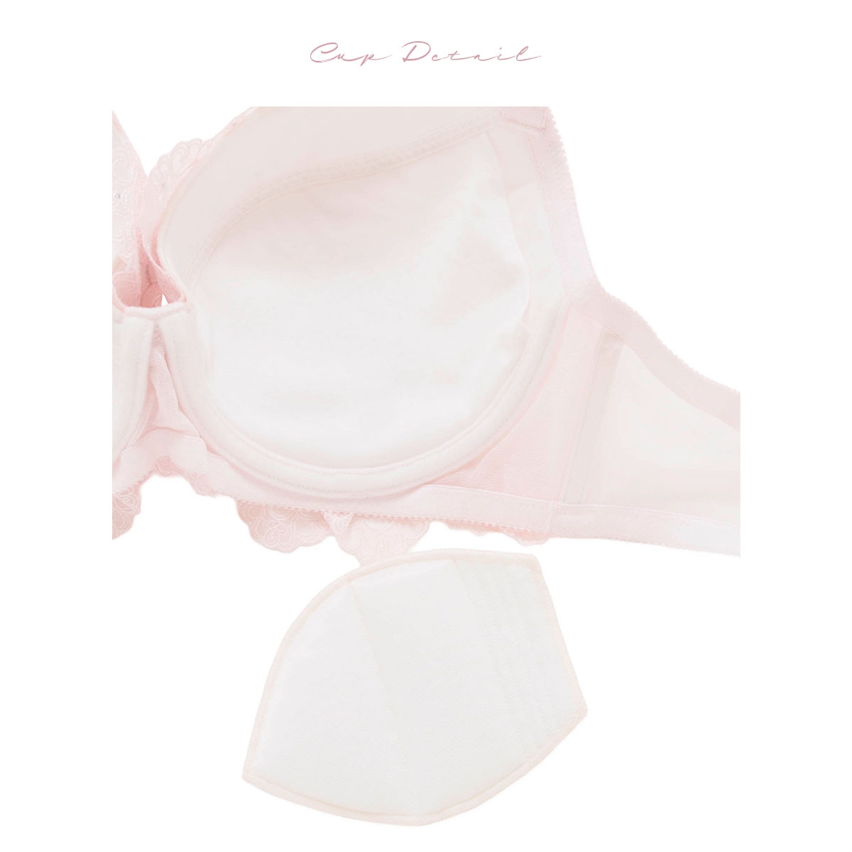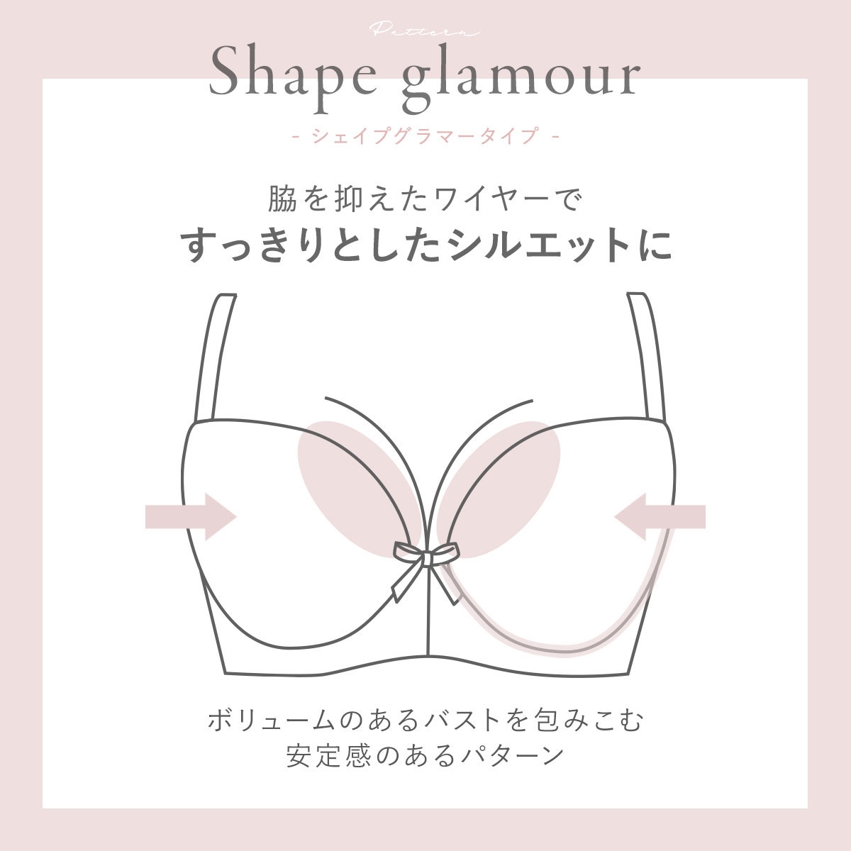 グラマーサイズ専用のカップパターンは、バストをきれいにしっかり包み込む深めのタイプ。幅を抑えたワイヤーを使用することで、脇のボリュームが出にくくすっきりと見えます。カップに内蔵されたサイドパネルはバストをぐっと持ち上げ、脇のもたつきを解消し、脇スッキリシルエットを作ります。