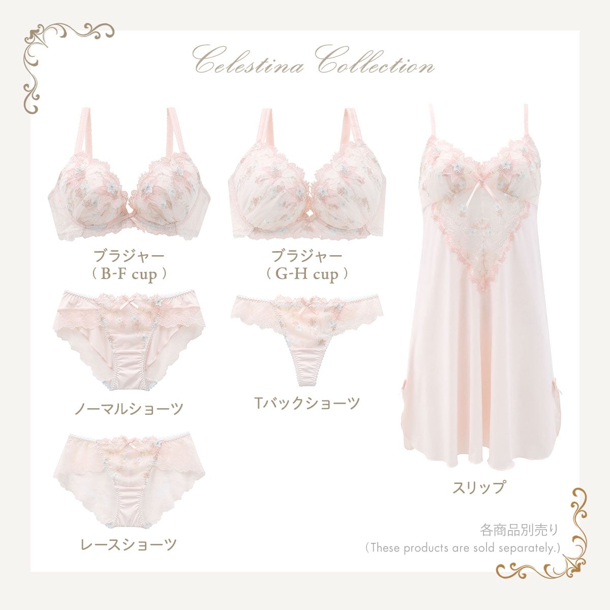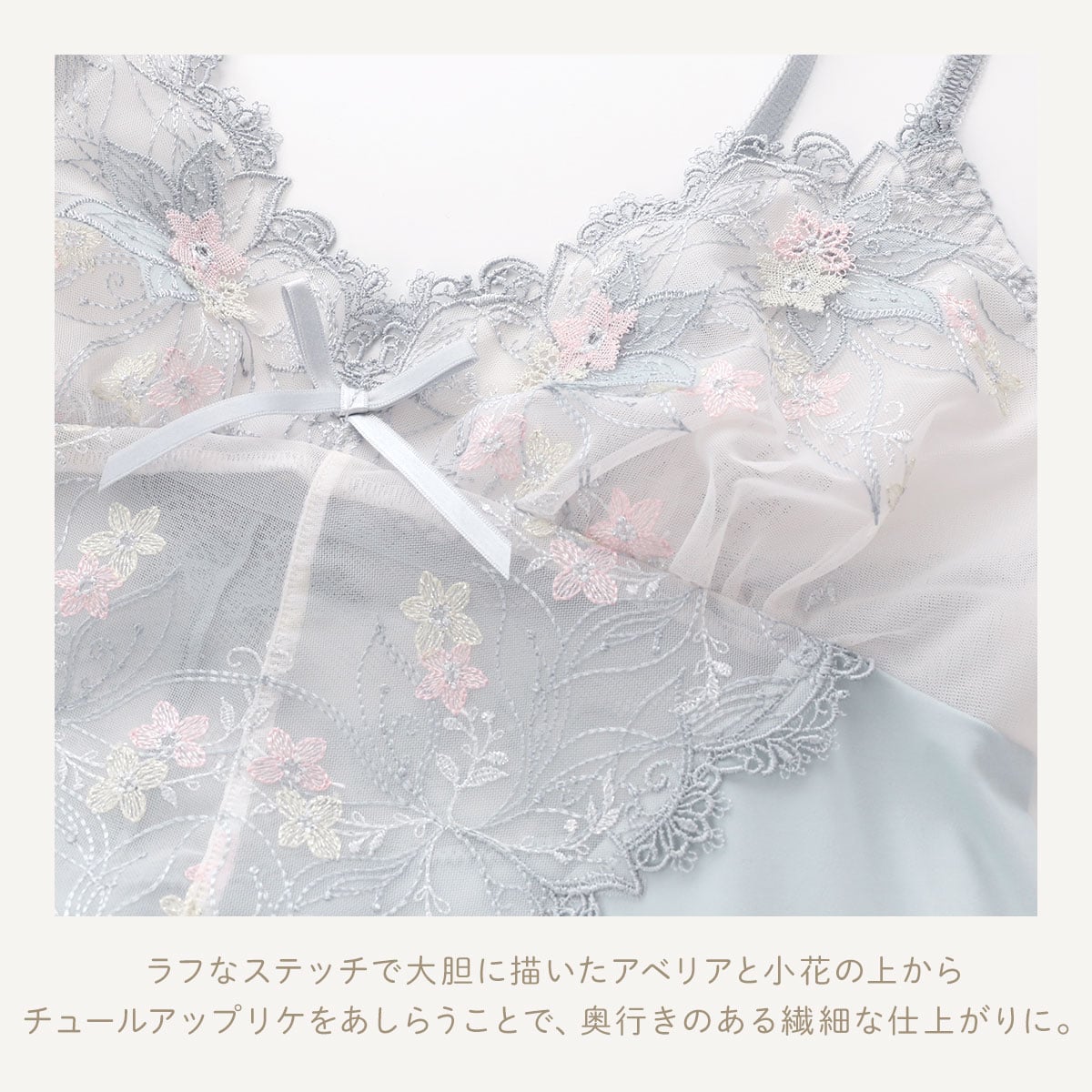 可憐に咲くアベリアのお花をイメージした、リサマリレーヌ「セレスティナ」コレクション。レースにはラフなステッチで大胆に描いたアベリアと小花を刺繍して、その上からお揃いのチュールアップリケをあしらうことで、奥行きのある繊細な仕上がりに。さらにツイード風の網目模様をほどこした小花のアップリケを重ねて、キラキラと輝くラメ糸とワンポイントのカラーリングが、お花がふわっと浮き出ている様子を可愛らしく表現しています。