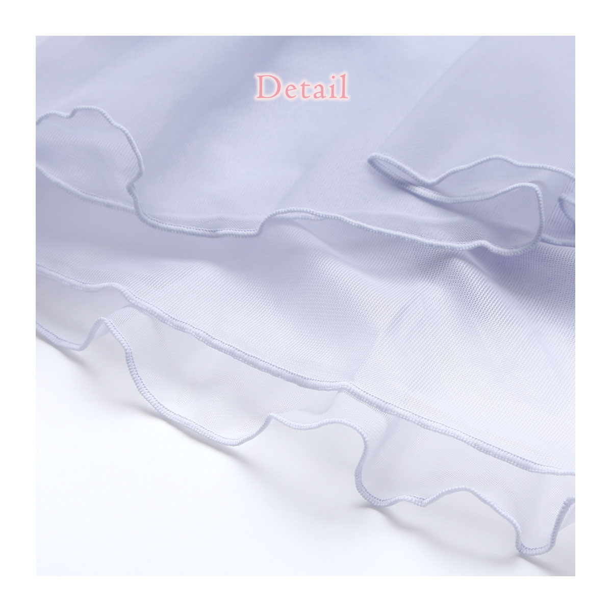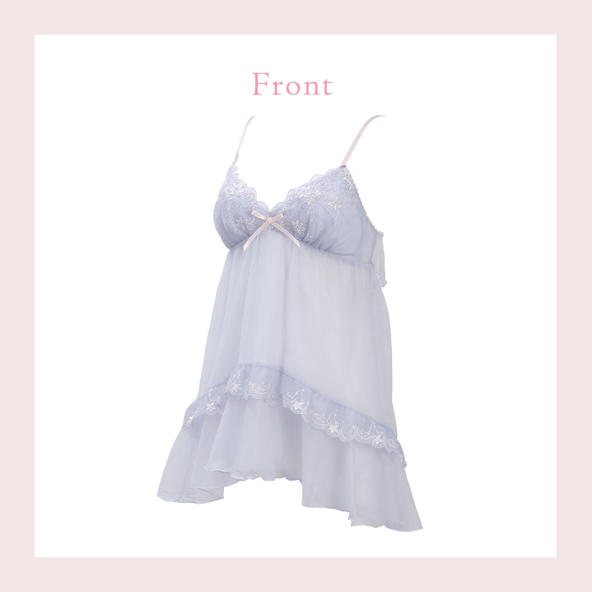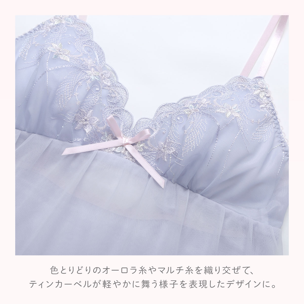 パッドの取り外しができる、カップ付きスリップ。透け感を楽しめる2枚重ねのチュール素材が可愛らしいデザイン。中央の切り替えと前後で丈感を変えるデザインで、妖精のドレスのようなフレアシルエットに。羽のようにラウンドカットしたチュールと小花のアップリケをあしらったバックスタイルが華やかな印象です。ストラップはアジャスターつきで長さの調節ができます。