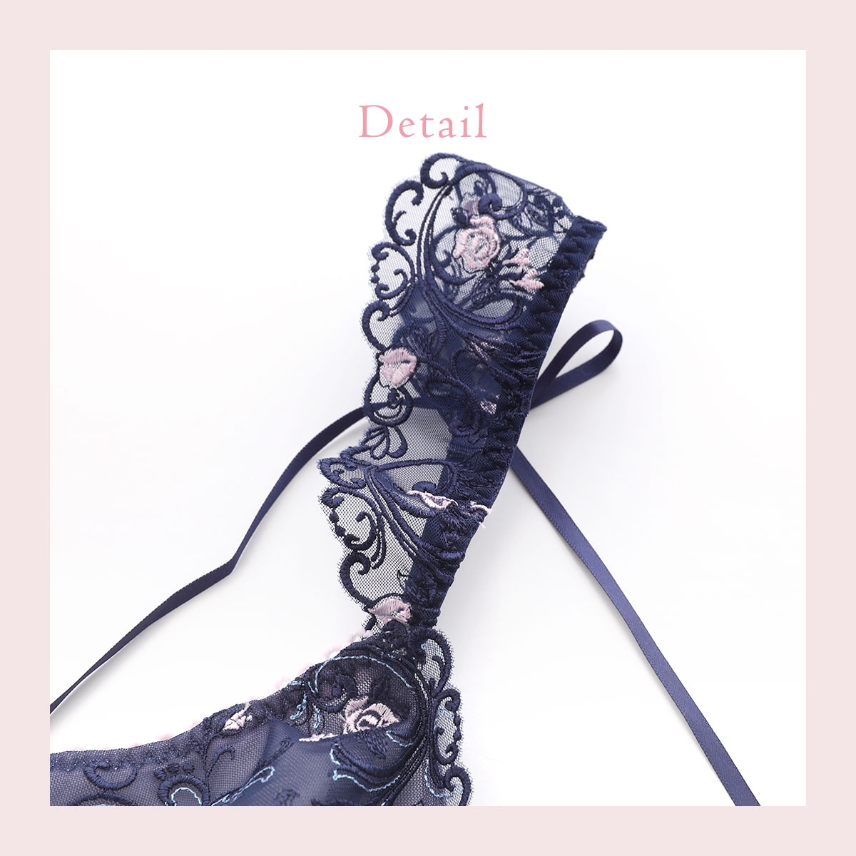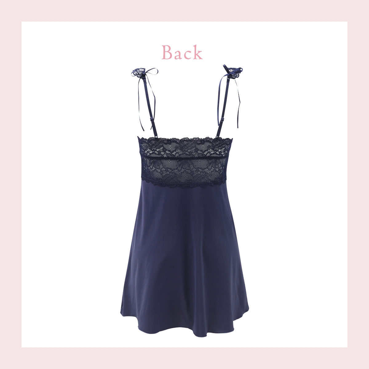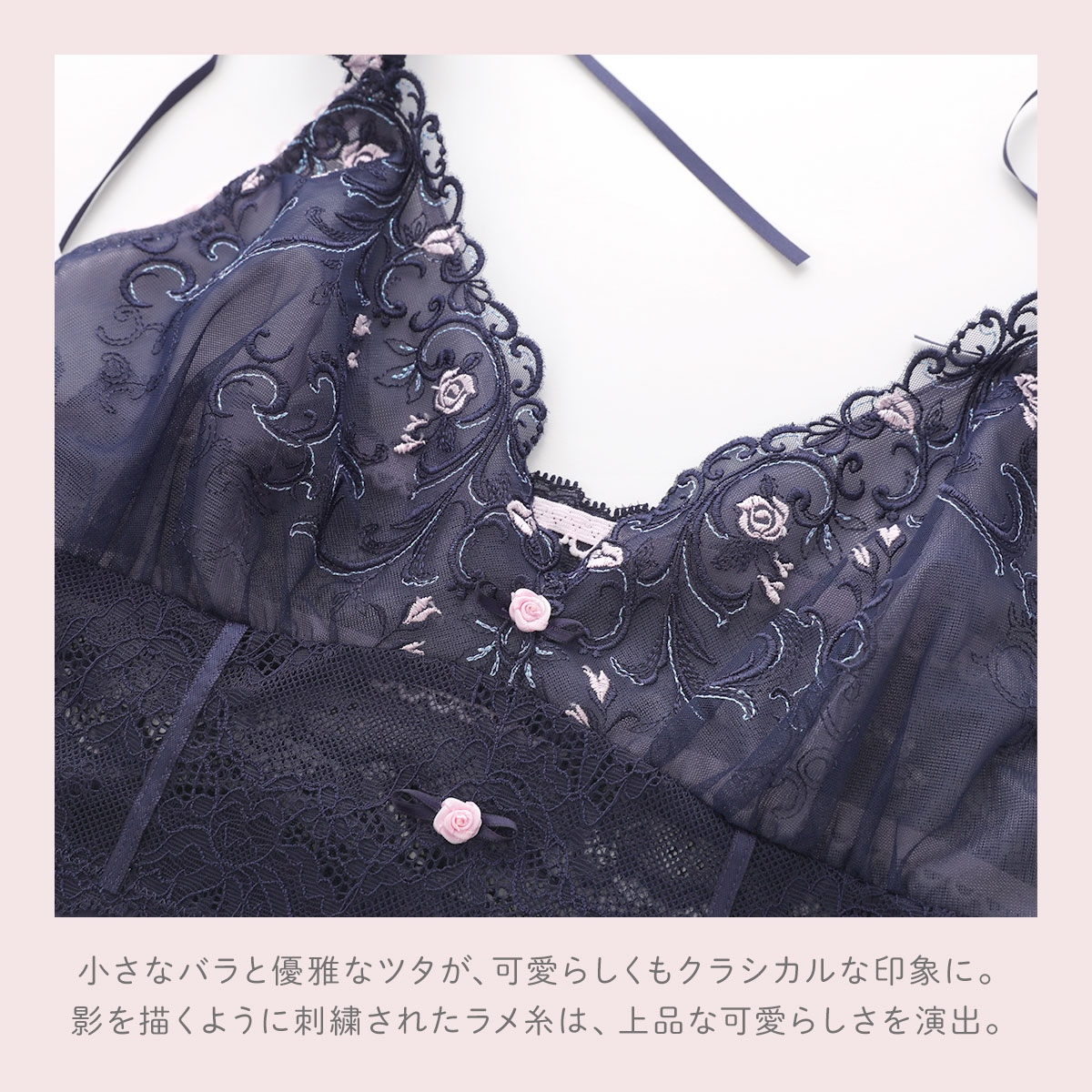 カップ下の切り替えとバックスタイルのストレッチレースが美しいスリップ。身体のラインを美しく演出してくれます。ストラップには刺繍レースをほどこして、バックスタイルには結べるタイプのリボンをあしらいました。