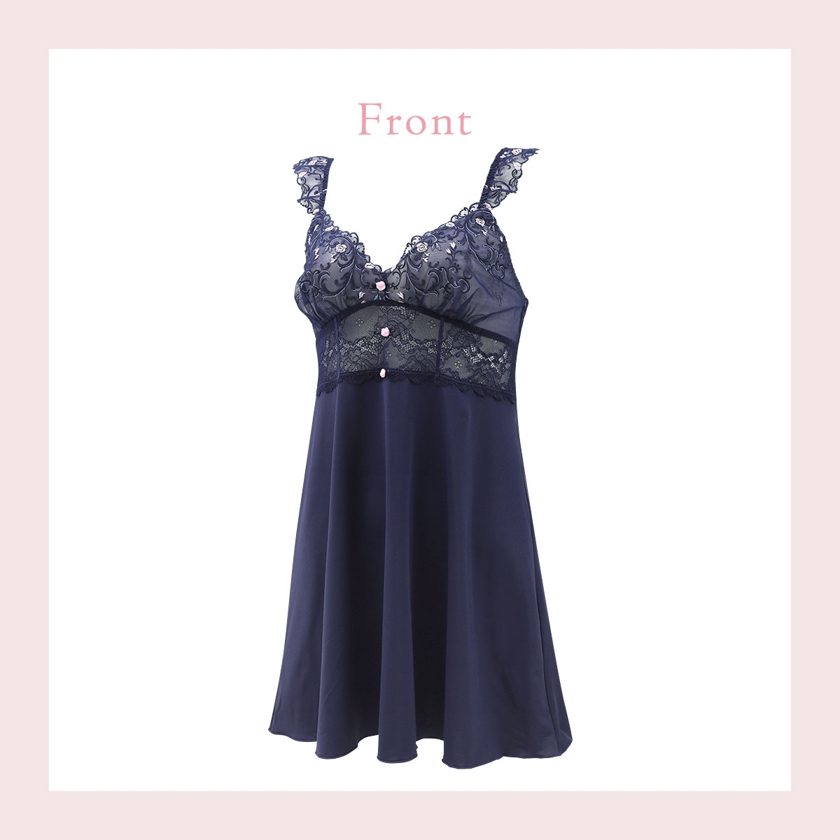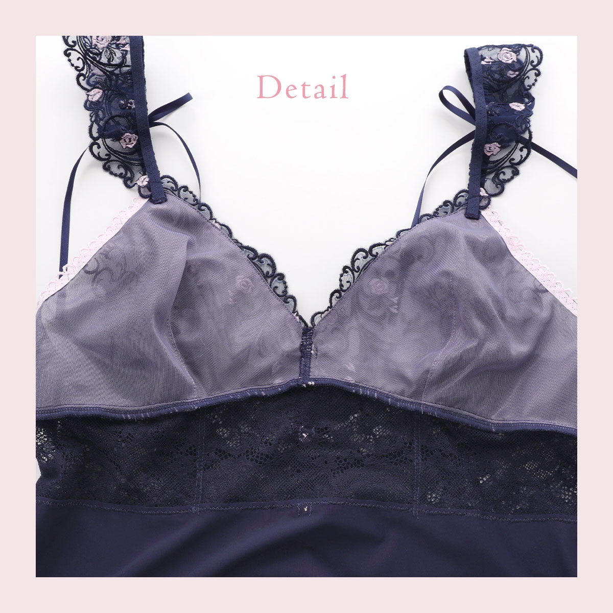 | 仕 様 | ・透感:レース部にあり(胸もと裏打ち付き) ・カップなし ・肩紐調節:可能 ・スリット:なし